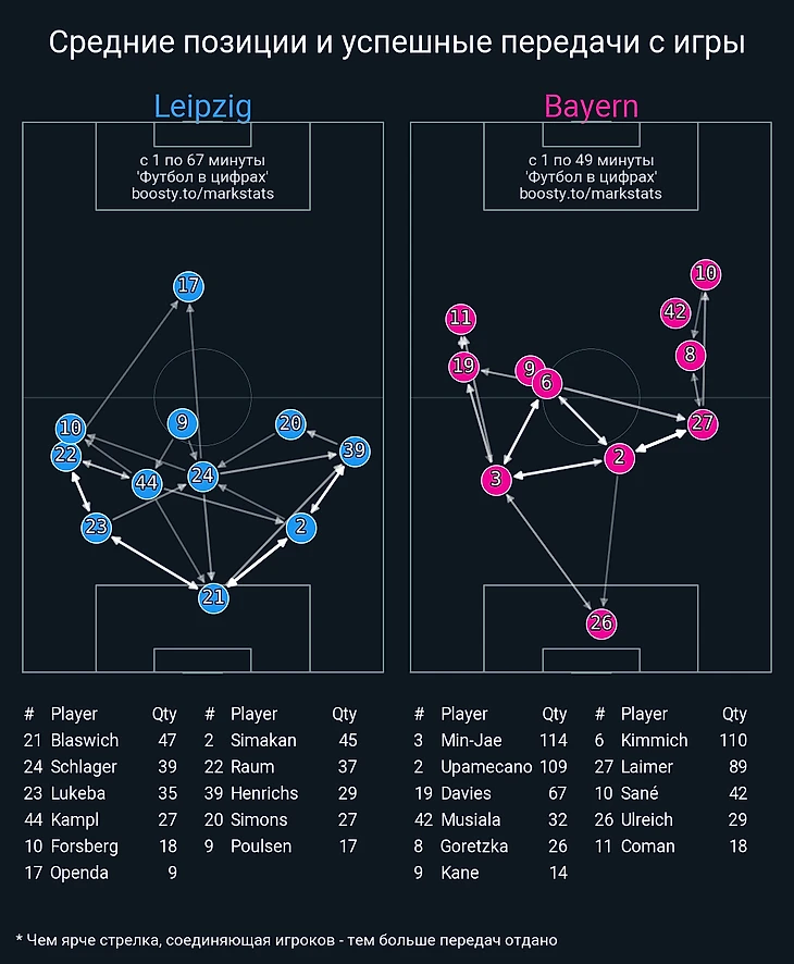 Розе, кроме всего прочего, умело использовал дрожь в коленях соперников, переключая прессинг-режим на контратаки и обратно. Когда Упамекано и Ким допускали ошибки, а страж ворот гостей чувствовал себя неуверенно, «быки» реактивно врезались в открытое пространство, благодаря чему в итоге и пришёл гол Опенда. Даже карта средних позиций кричит об этом: Лои постоянно ждал момента передачи от партнёров, весь первый тайм действуя значительно выше Кейна.