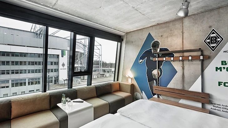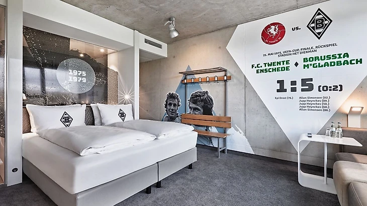 Только что открывшийся на территории «Боруссия-Парка» отель построен клубом в партнерстве с Lindner-Group (инвестиции в проект — 35 миллионов евро в соотношении 40 на 60), входит в гостиничную сеть H4 и относится к категории «4 звезды». Стоимость номеров — от 112 до 130 евро в сутки. На нижнем фото — комната, оформление которой напоминает о победах клуба в Кубке УЕФА 1975 и 1979 годов. Изображение на одной из стен иллюстрирует события второго финального матча 1975 года, в котором «Боруссия» после нулевой ничьи в первой игре со счетом 5:1 разгромила «Твенте»