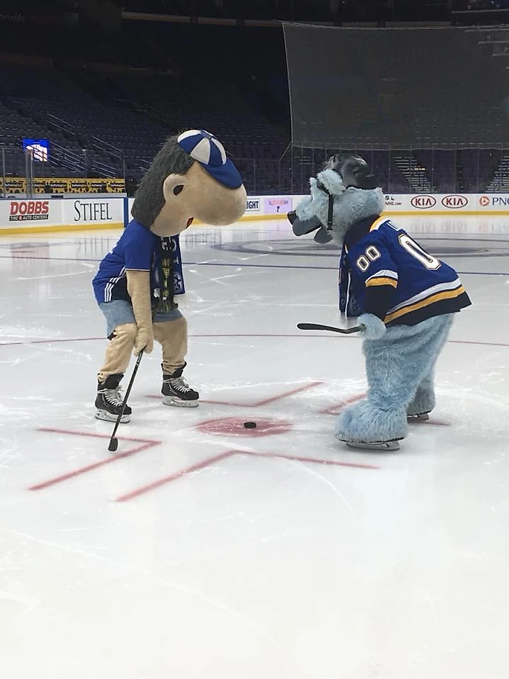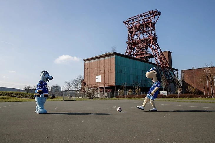 Кросс-промо акции «Шальке» и «Сент-Луис Блюз». Маскоты клубов — некто Эрвин и синий полярный медведь Луи играют в футбол на фоне закрытой угольной шахты (Гельзенкирхен, Германия) и в хоккей — на льду домашнего для «Блюз» «Скоттрейд Центра» (Сент-Луис, Миссури, США)