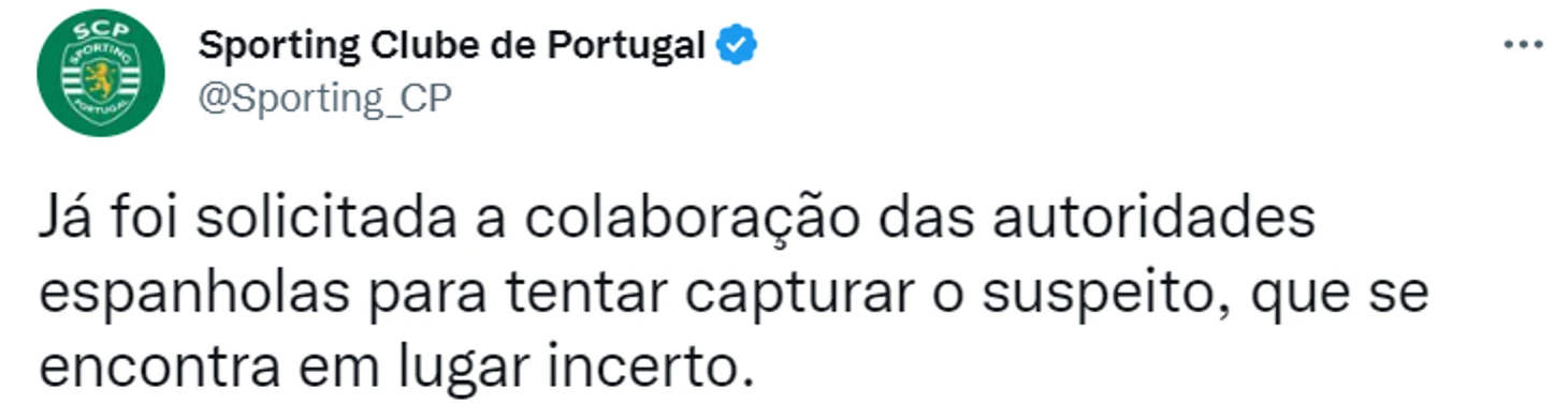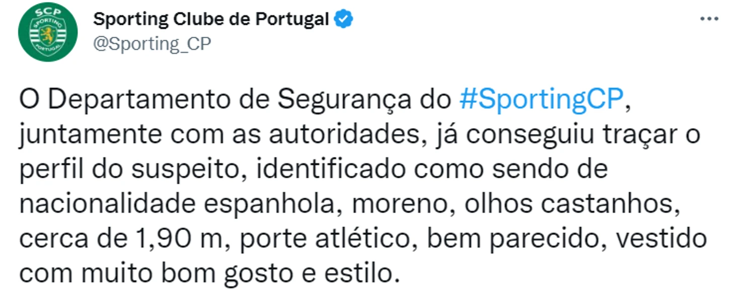 «Департаменту безопасности «Спортинга» совместно с властями удалось составить профиль подозреваемого, идентифицированного как гражданин Испании. У него темные волосы, карие глаза, рост примерно 190 см, спортивное телосложение, красивый внешний вид, очень хороший стиль одежды».