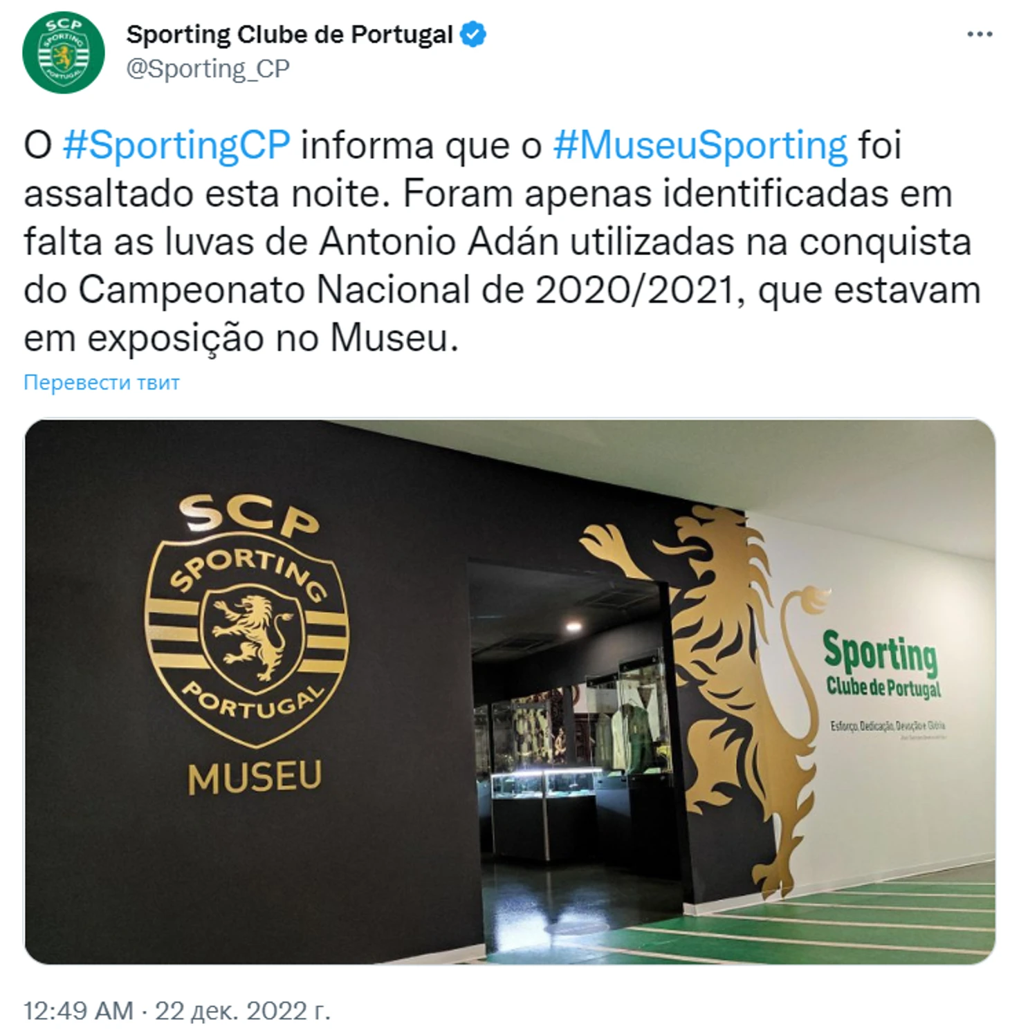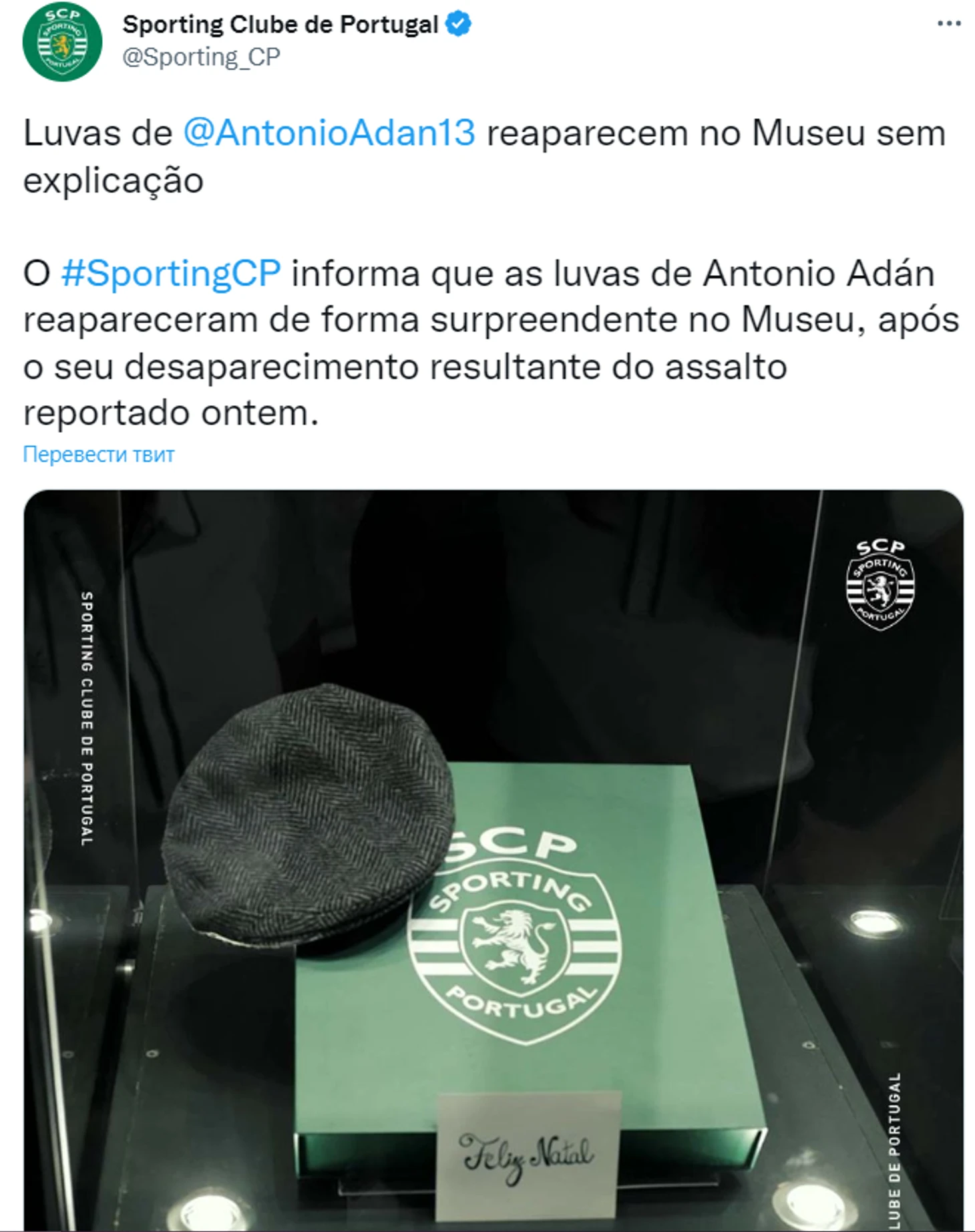 Сегодня официальный аккаунт лиссабонского «Спортинга» сообщил о том, что из клубного музея пропали перчатки, которые носил Антонио Адан, бывший вратарь «Мадрида» и воспитанник клуба. Они стали ценным экспонатом из-за того, что игрок носил их в сезоне-2020/2021, когда «Спортинг» спустя 18 лет вернул себе чемпионский титул.