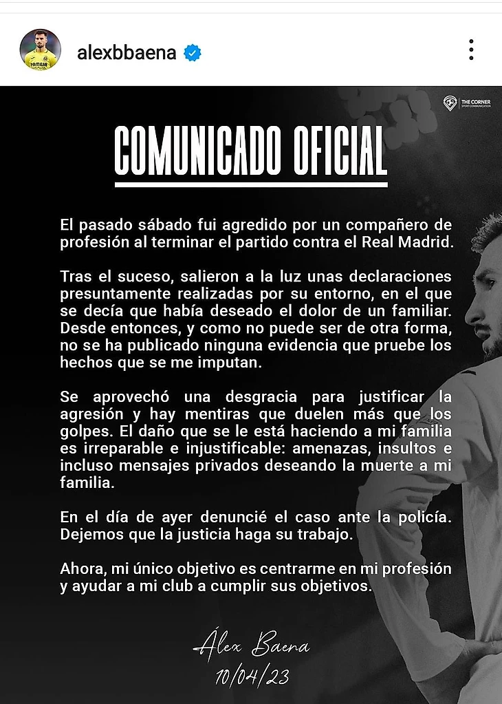 Защитник «Вильярреала» Алекс Баэна сделал официальное заявление по поводу инцидента на парковке после матча с «Вильярреалом».