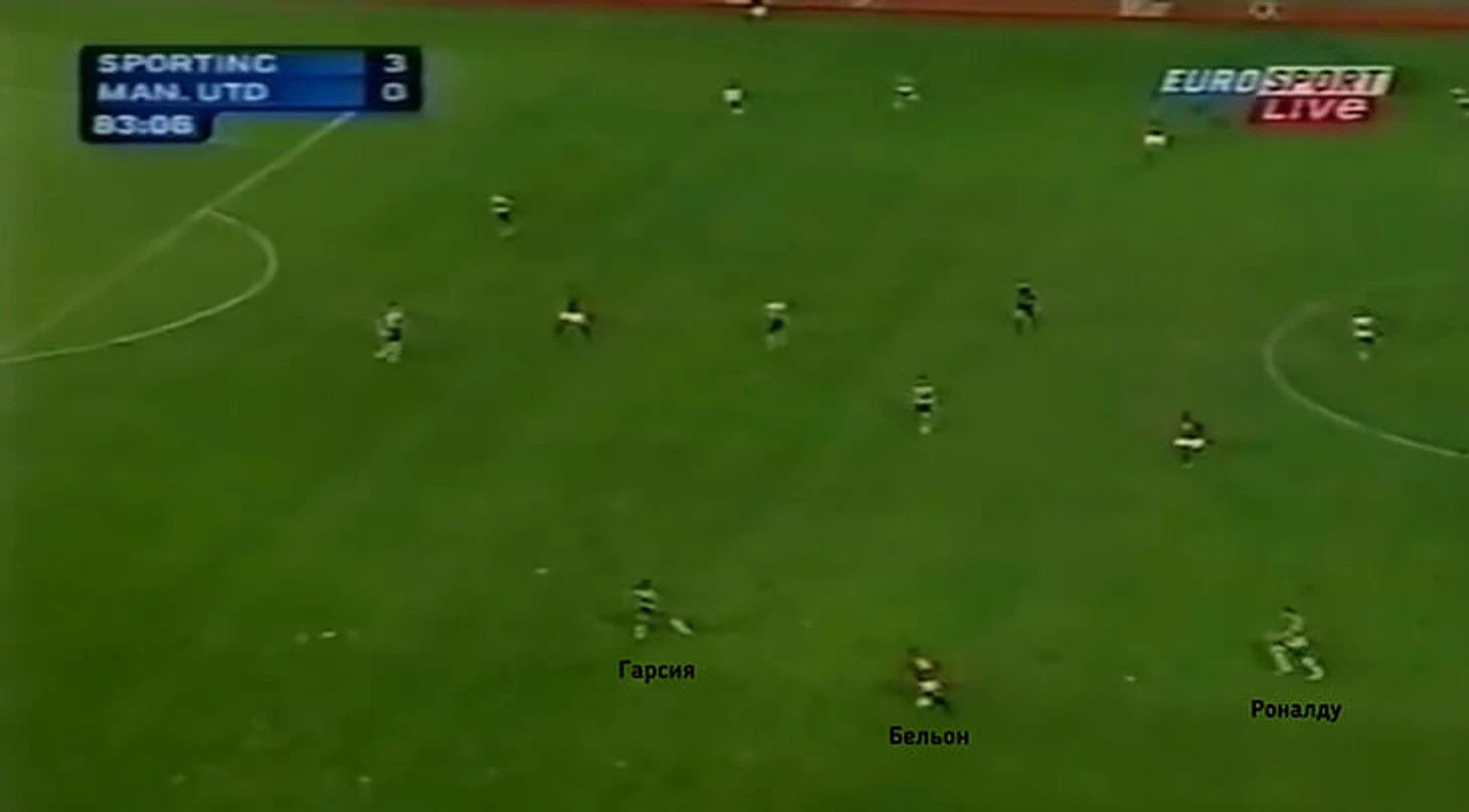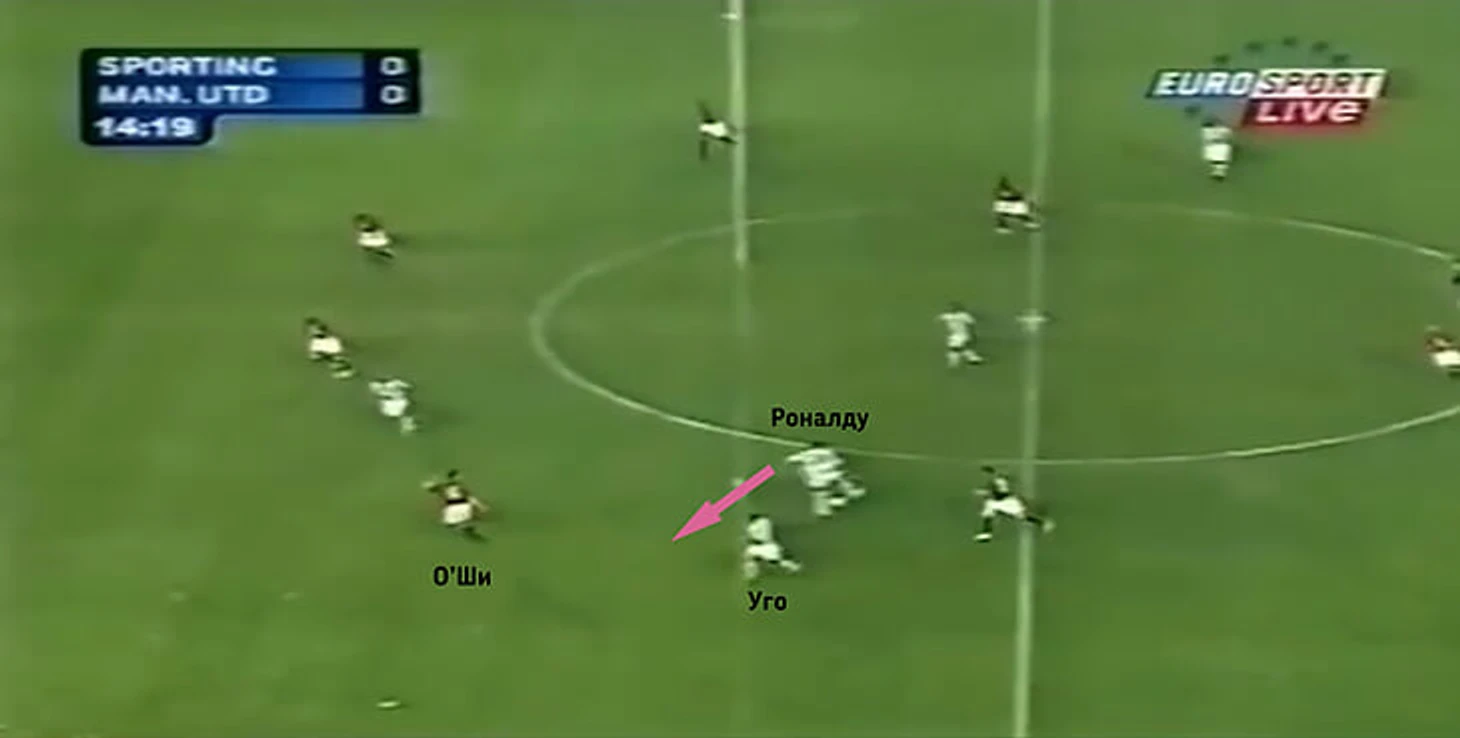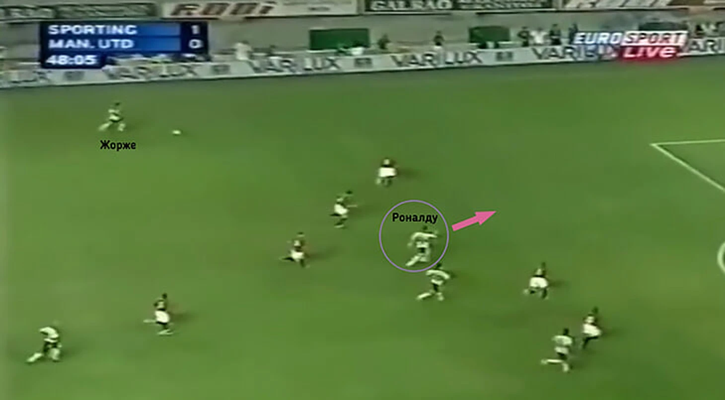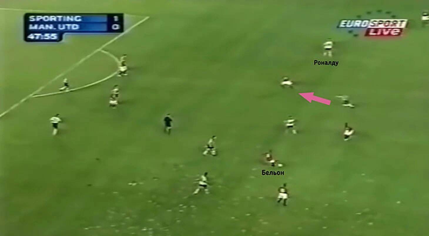 В этом эпизоде «Спортинг» оборонялся позиционно, а Роналду находился на позиции левого полузащитника.