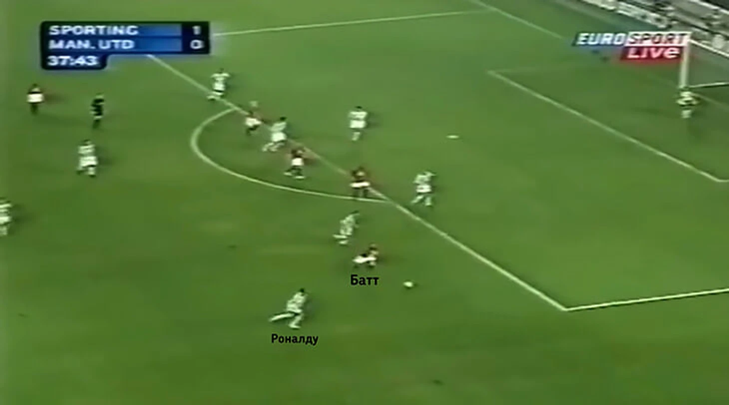 Еще один быстрый переход из обороны в атаку от «Спортинга». На этот раз Криштиану действовал в более привычной манере – тащил мяч вперед на полной скорости. Изначально казалось, что он остался 1-в-1 с Рио Фердинандом, однако игроки «МЮ» во главе с Полом Скоулзом оперативно вернулись назад и помогли защитнику. Закончить атаку быстро не получилось, но Роналду все равно нашел хороший вариант для ее продолжения – убрал мяч под правую и отдал точную передачу на партнера.