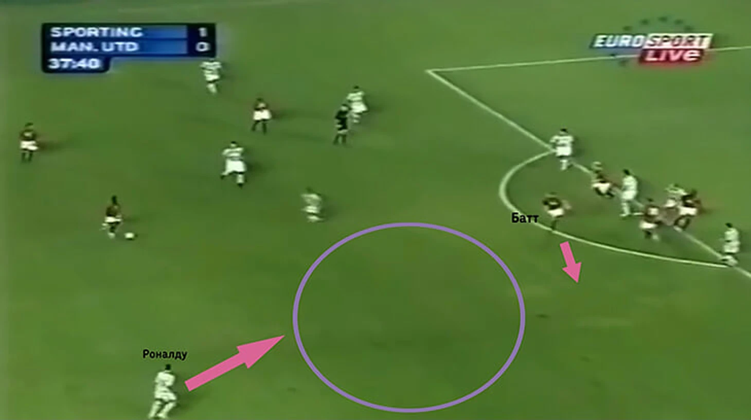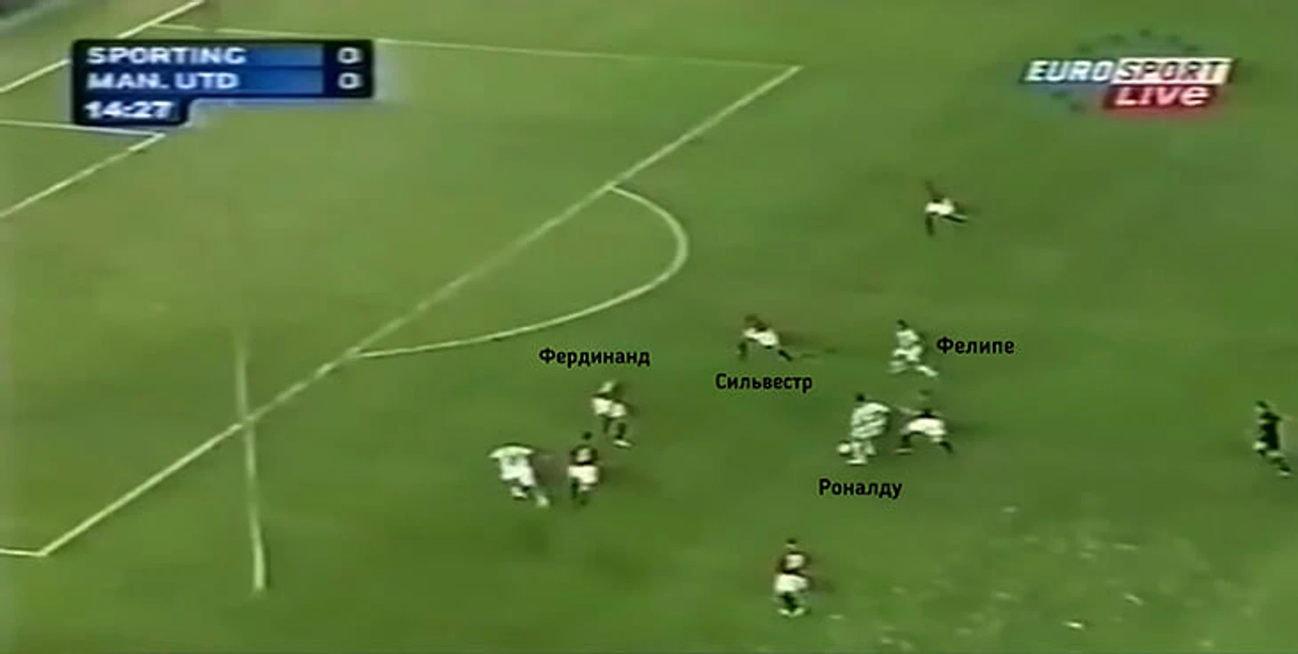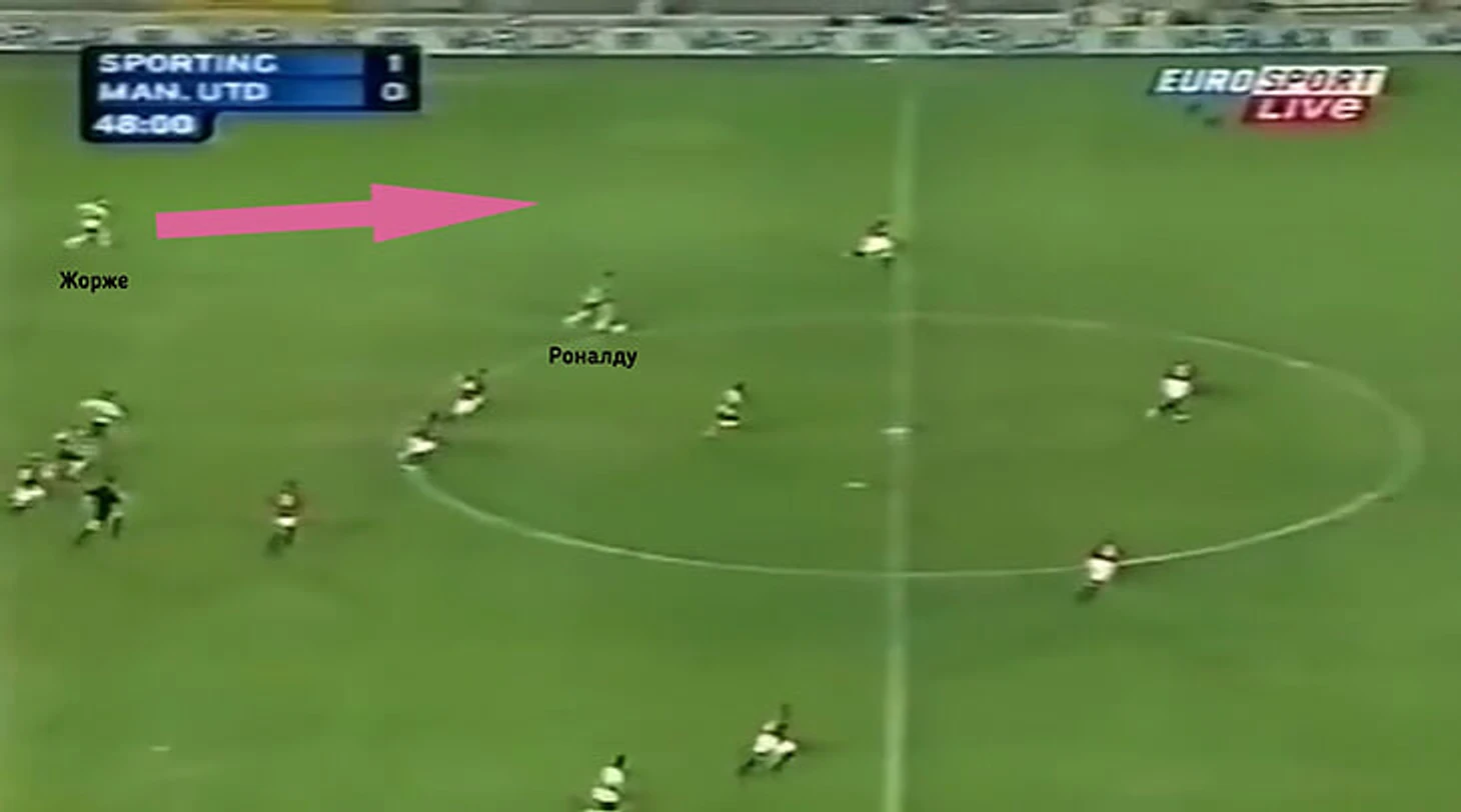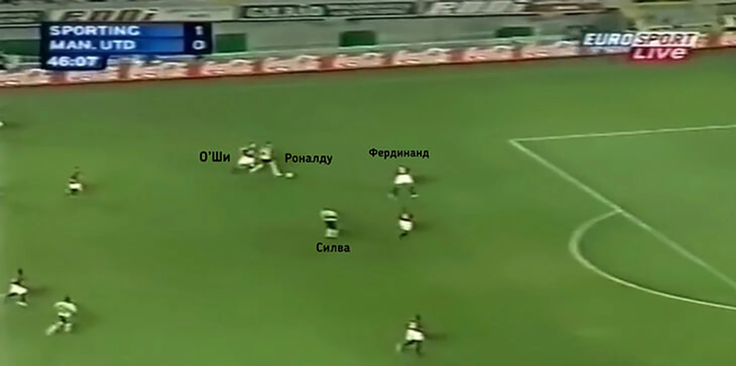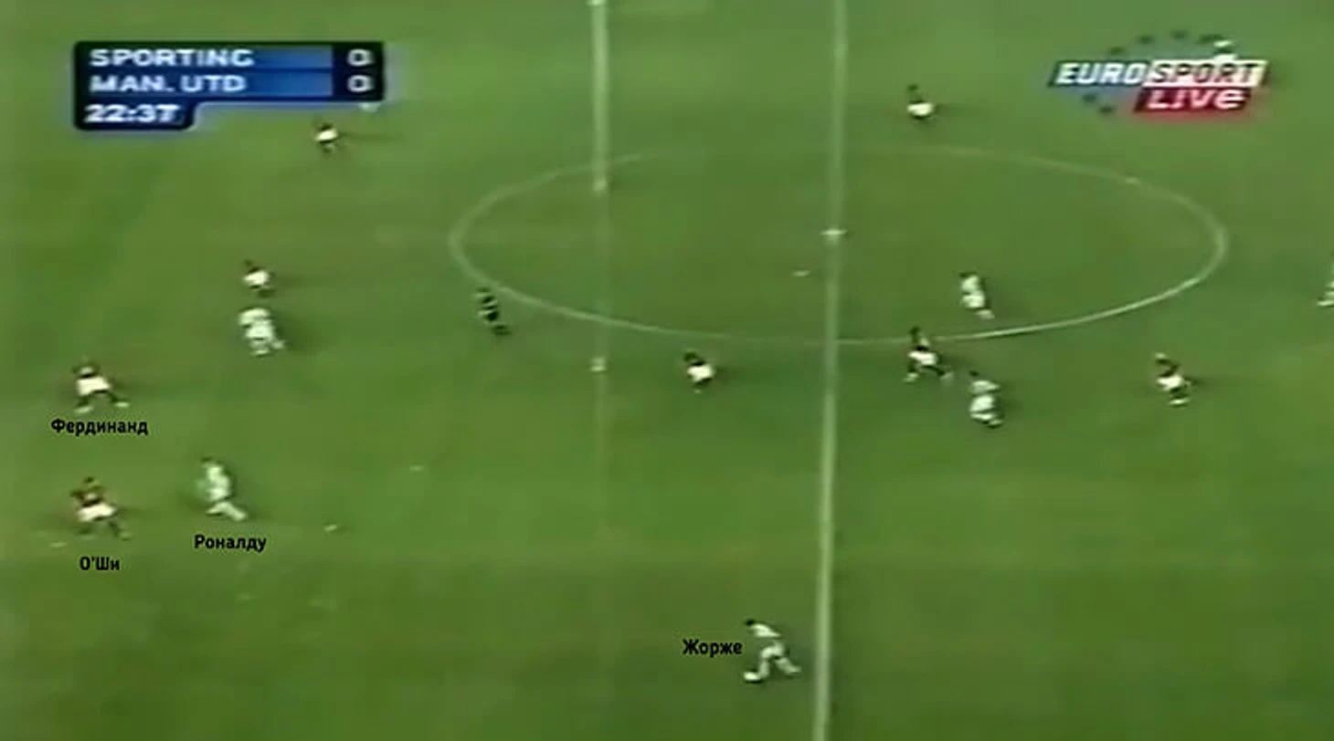Вместо этого Криштиану отдал пас на ход Жорже, который подключился к атаке по левому флангу. Затем Роналду увидел свободную зону за спиной Фердинанда и открылся туда, однако Жорже решил развернуть атаку назад.