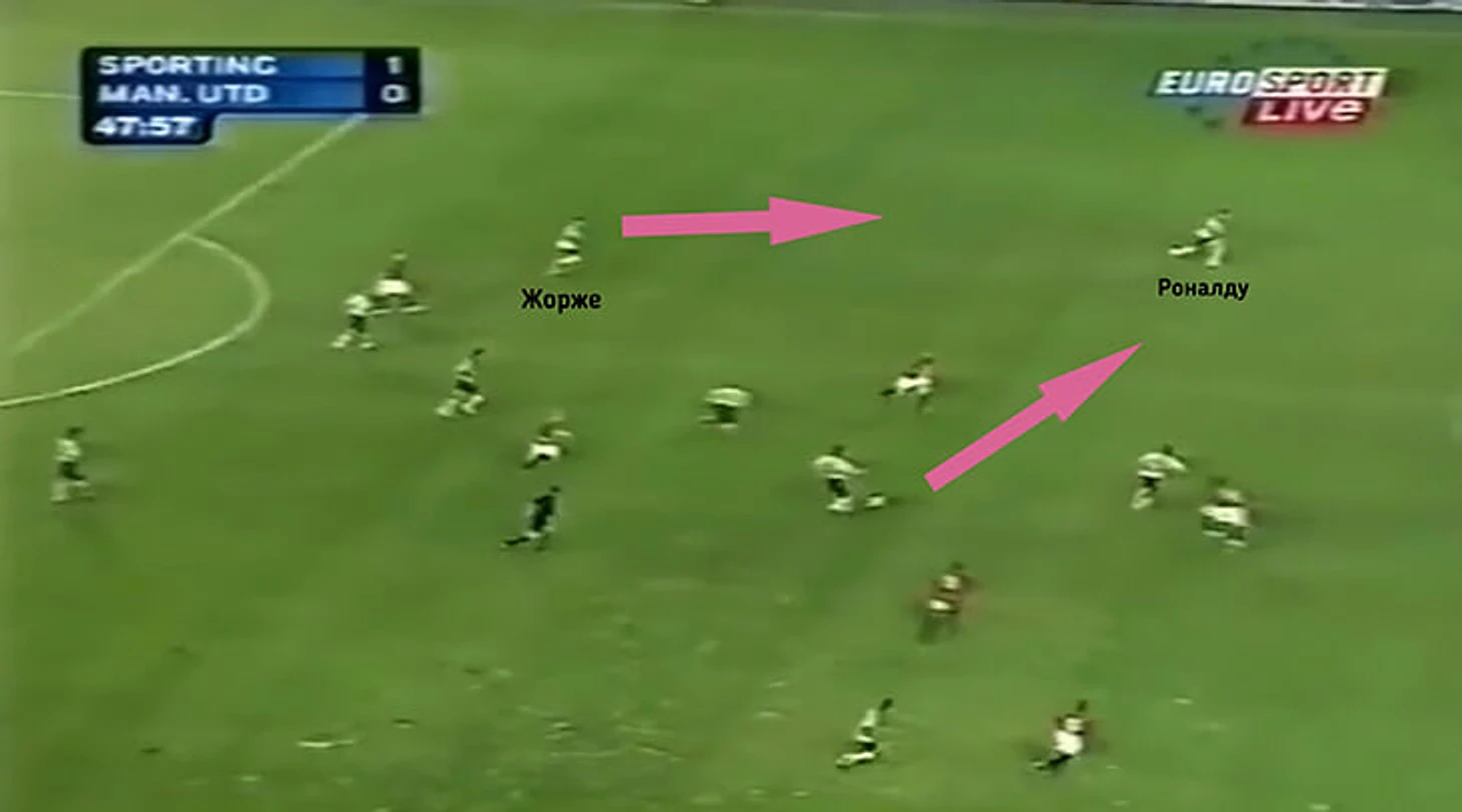 Помимо ярких индивидуальных действий Криштиану также неплохо взаимодействовал с партнером по флангу – левым защитником Жорже. Именно после их перепасовки «Спортинг» открыл счет в матче. Жорже получил мяч на бровке, а Роналду, чтобы не находиться с ним на одной линии, сместился в полуфланг.