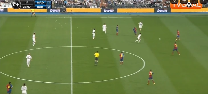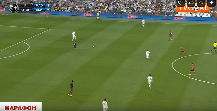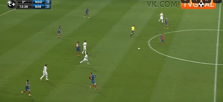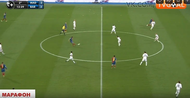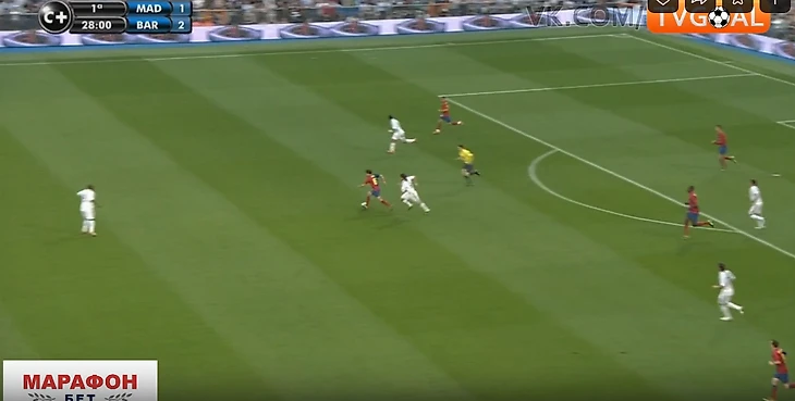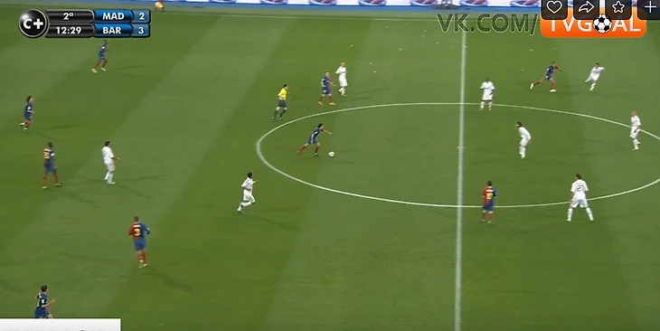 9. Во втором тайме Реал ничего не поменял тактически и схематически, но стал двигаться быстрее, встречать при получении мяча.Прессинг стал более слаженным, появилась компактность - уже не было таких разрывов между линиями за счет того, что 4-ка оборонцев поднималась при прессинге. Но Барсе часто все равно удавалось его разбивать - шикарное движение открывало варианты для быстрых передач, порой за счёт дриблинга. Реал часто терял мяч, возвращаться успевали не всегда.