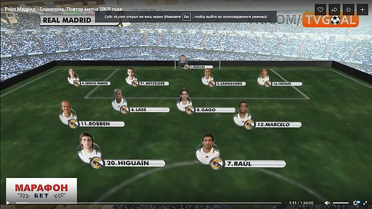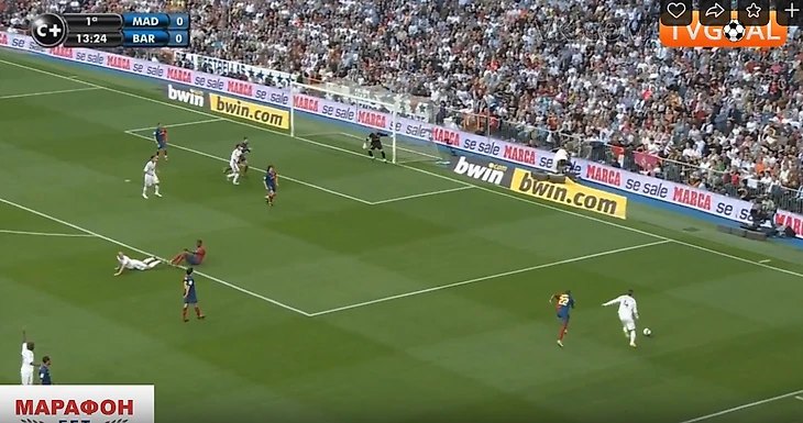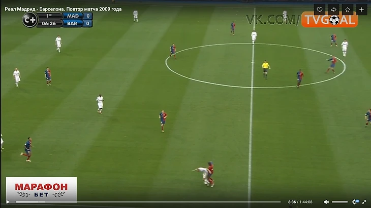 4. При обороне Реал располагался в 4-4-2 с высокой линией защиты. Идея такого расположения в том, что бы за счет компактности (расстояние между линией защиты и атаки 25-30 метров) лишить соперника свободного пространства в центре поля – самой опасной для противника зоны этой Барселоны. Такая концепция может быть успешной только при наличии условий синхронного смещения всех линий команды в зависимости от расположения мяча и прессинга на игрока, владеющего мячом. При выполнении этих условий команда лишает возможности оппонента свободно принимать мяч, оценивать расположение партнеров, и развивать атаку дальше. На деле картина была следующей: необъяснимая пассивность игроков Реала, нет достаточного давления на игрока соперника в момент приема мяча и передачи.