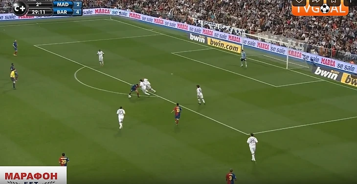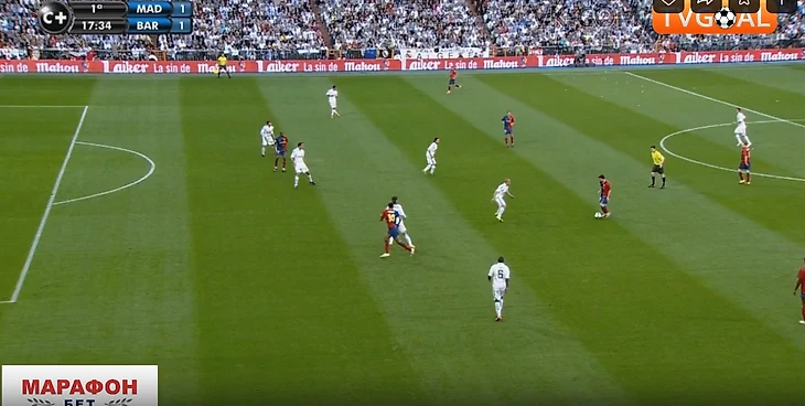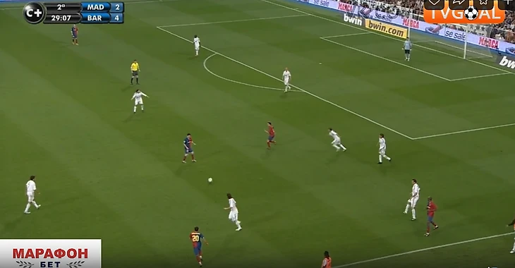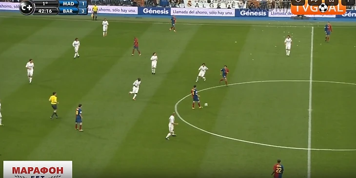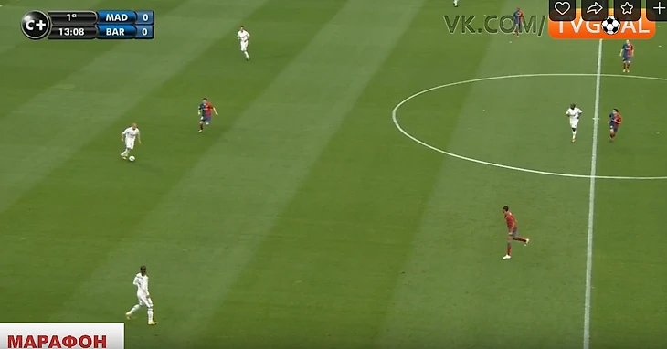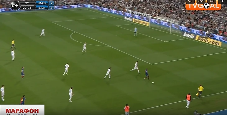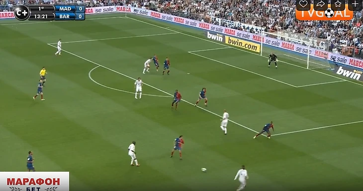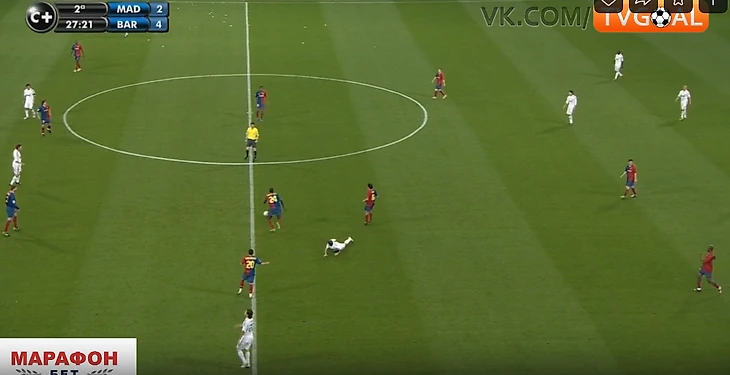 Крайние полузащитники не смещались ближе к центру для создания численного равенства в этой зоне (Роббен и Марсело). Они предпочитали оставаться ближе к своим флангам, боясь оставлять крайних защитников в численном меньшинстве ( Рамос против Абидаля и Анри справа, и Хайнце против Это'O и Алвеса – слева). Иногда опускался ниже помогать в центре кто-то из пары нападающих Рауль/Игуаин, но этого было недостаточно – количественное преимущество Барсы сохранялось (4 против 3). Кто-то один из 4-ки всегда был свободен абсолютно, имея кучу времени посмотреть, подумать, как развить дальше атаку. Конечно, тут заслуга и самой этой 4-ки, которая была не статична, а всегда двигалась, меняясь позициями, ещё больше усложняя задачу Реалу их сдержать.