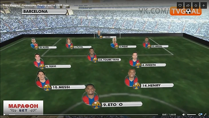 2. В первые 5 минут предложенная схема и расположение Барсы испанскими телевизионщиками соответствовали реальности, то есть Месси – справа, Это'О – в центре атаки. Реализация «ночной» идеи началась с 6-й минуты.Предполагаю, сделано это было умышленно с целью запутать соперника: сначала создать впечатление, что никаких неожиданностей по схеме и ролям не будет, а после выкатить новый план.