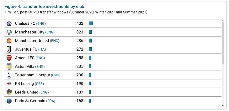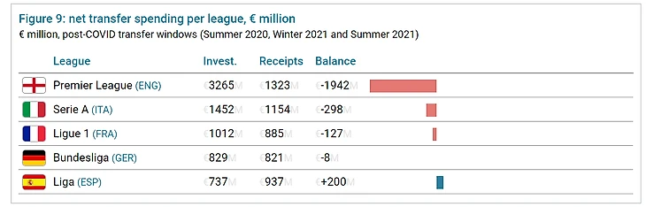 Ну а что самое главное - это резкое падение расходов по сравнению с двумя предыдущими годами: в 2019, до начала пандемии, общие траты составляли 6,65 млрд. евро, но уже в 2020 упали на 28%, а в этом - ещё на 19%. Мы говорим, что вроде бы футбол приходит в себя после финансового кризиса, оздоравливается, но цифры это подтверждают лишь отчасти. Лучше себя чувствовать стали только отдельные клубы, в целом же, кажется, что денег у команд стало ещё меньше, чем год назад, и это при том, что уже нет полного локдауна, приостановки чемпионатов и прочих проблем, которые раньше повергали многих просто в шоковое состояние.