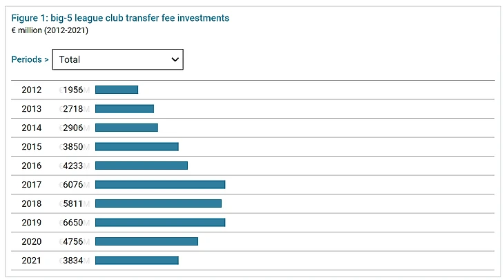 В новом отчёте CIES с финансовой точки зрения анализируются оплаченные транзакции, имевшие место в течение последнего десятилетия, в которых участвовали команды из пяти основных европейских лиг: английской Премьер-лиги, испанской Ла Лиги, немецкой Бундеслиги, итальянской Серии А и французской Лиги 1. Охватываемый период простирается от трансферного окна зимы 2012 года до последнего летнего окна.
