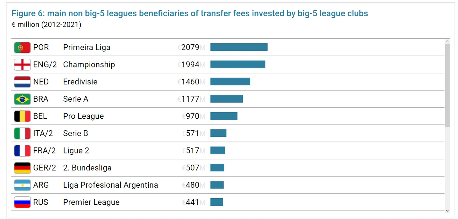 А если вне топ-5 лиг, то куда? Ну, на 2 млрд. за 10 лет наторговали в Португалии и английском Чемпионшипе. Прочие сильно отстали. Приятно видеть в топ-10 РПЛ, но показатели скромные, на уровне второй Лиги Испании. Вообще, в топ-10 сразу 4 вторых дивизиона, что радует - значит, деньги хорошо ходят между дивизионами и более бедные и менее известные клубы неплохо себя чувствуют. Хотя можно и посетовать, что футбол в плане финансов сильно замкнут в пределах некоторых стран. Например, мы знаем, как умеют продавать в Хорватии или Аргентине, но во второй лиге Италии или Франции продают лучше. Про Англию даже начинать не буду. Периферия, по-прежнему, ей и остаётся.