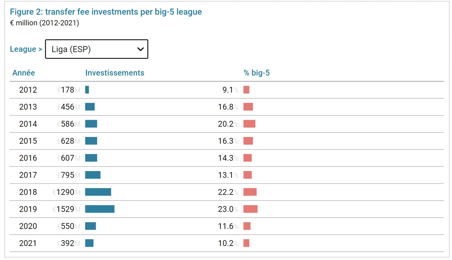 Сравните с Бундеслигой. Во всех лигах стали тратить меньше, но как же жёстко в Испании просели первые 5 команд по расходам - сокращение, более чем в 2 раза.