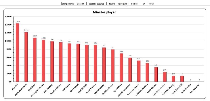 Добавляя к этим троим Джастина Клайверта и Лазара Самарджича, а также вспоминая о возможностях Амаду Айдары и Марселя Забитцера подниматься выше по полю, получаем очень крепкую ситуацию на позициях с возможностью адекватной ротации. Это выливается и в игровое время – те же Форсберг и Ольмо хоть и выходят в каждом матче, но у них все равно меньше игровых минут, чем у фактически незаменимого на позиции левого латераля Анхелиньо.