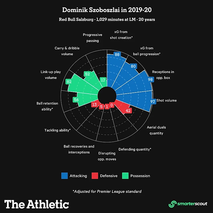 С Собослаи ситуация изначально проще, поскольку он уже приходит в «Лейпциг» как готовая восьмерка. Да, у него есть определенный перевес в сторону атаки и даже слишком парадоксальный недостаток оборонительных качеств для игрока, приходящего из одной из самых прессингующих команд Европы. На графике ниже представлены данные относительно стандартов английской Премьер-лиги (ходили довольно активные слухи про его возможный трансфер в «Арсенал»). Определенные представления составить можно.