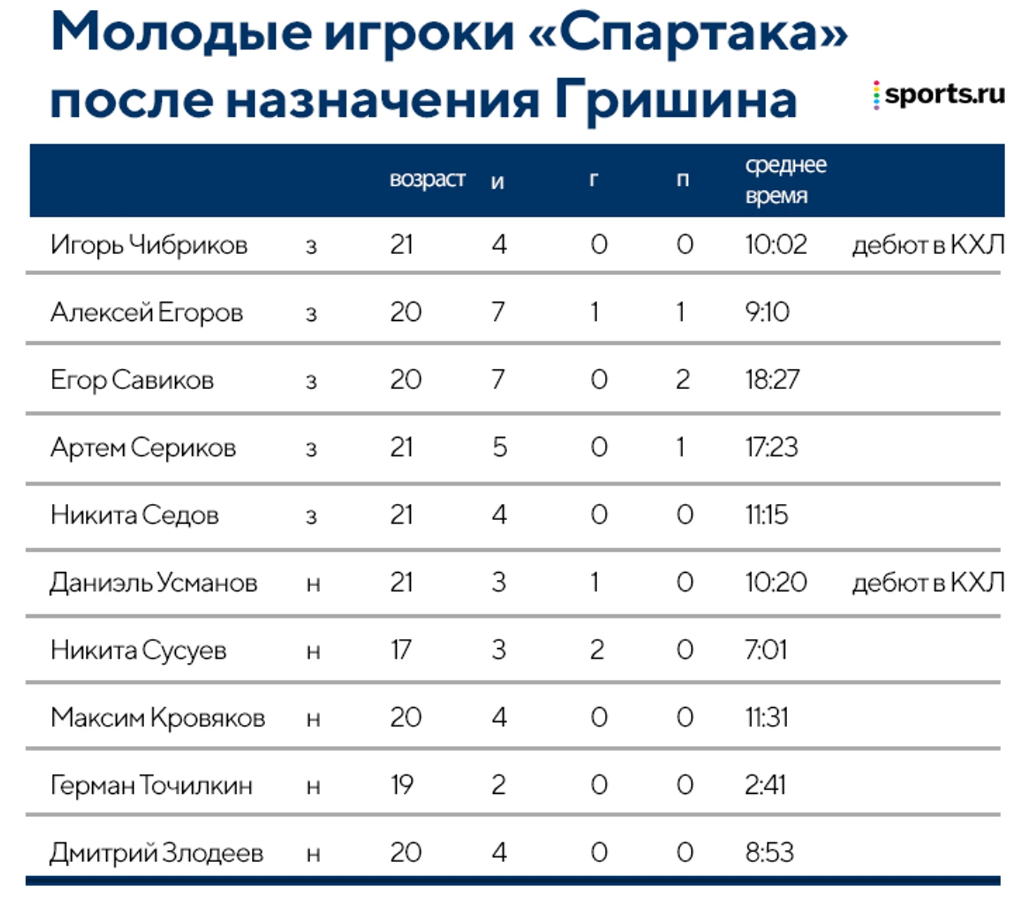 Помимо тактики новый тренер «Спартака» показал еще один редкий для КХЛ скилл – полное доверие молодежи. Как итог – в недавнем матче с «Трактором» сразу три игрока забросили свои первые шайбы в лиге – Алексей Егоров, Даниэль Усманов и Никита Сусуев (у которого вообще дубль в 17 лет).