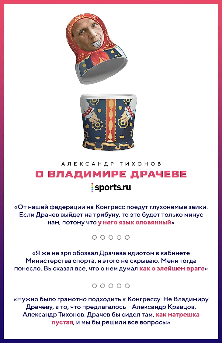 Мало кто вступал с Тихоновым в публичную перепалку, но накануне лопнуло терпение у заслуженных людей, среди которых – действующие руководители СБР. Виктор Майгуров, Сергей Тарасов и другие обратились к Тихонову с требованием быть сдержаннее.