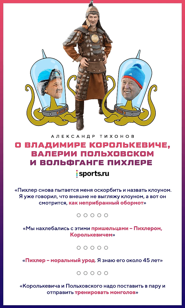 Отдельно доставалось и тренерам, особенно Вольфгангу Пихлеру, Владимиру Королькевичу (оба – иностранцы), а также давнему врагу Тихонова – Валерию Польховскому.