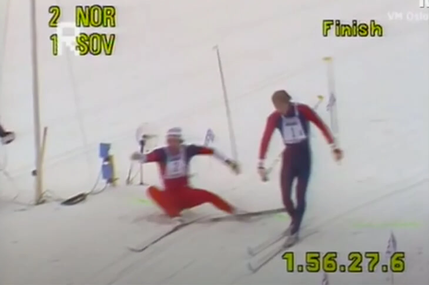 Холменколлен. Финиш в напряженной эстафете ЧМ-1982 – Александр Завьялов на полботинка опередил норвежца Оддвара Бро, а судьи в замешательстве отдали золото обеим командам.