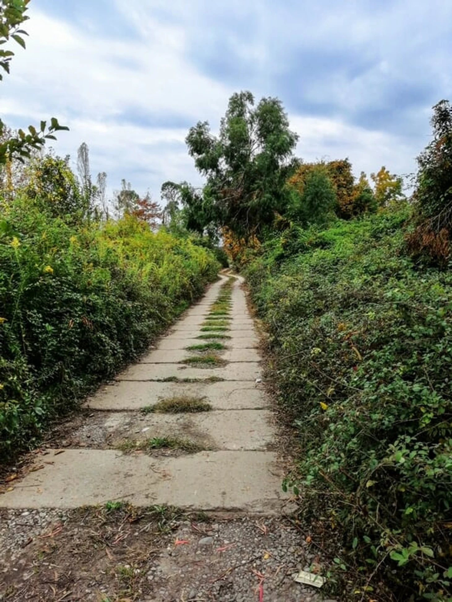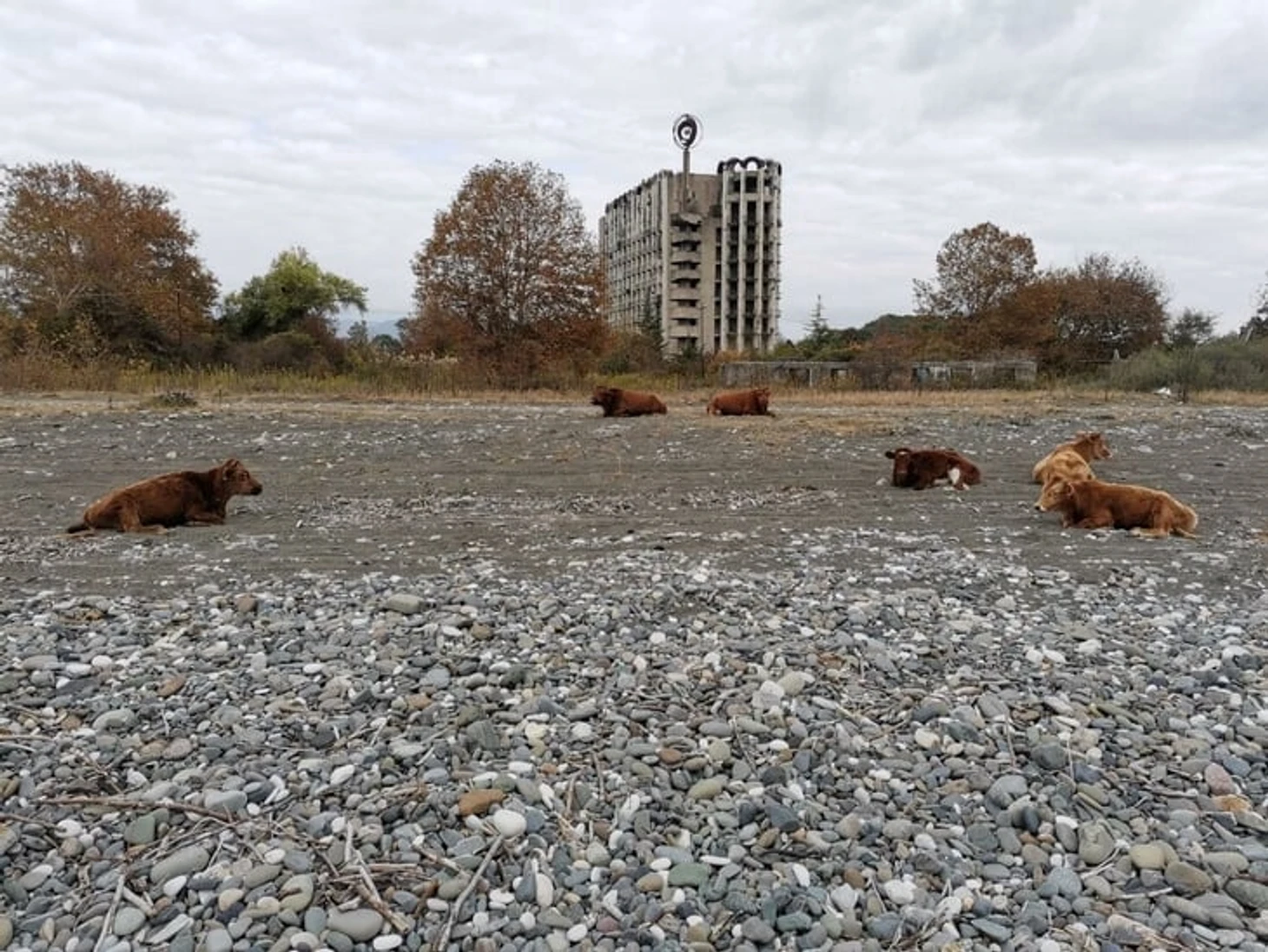 От памятника Ардзинбе до памятника олимпизму – 5 минут пешком сквозь бурьян, проволоку, обломки кирпичей и огороженную цветочную базу. У центрального входа, который никто не охраняет, папа с сыном рассекают дрова электропилой, а со стороны черноморского побережья – вальяжно пасутся коровы. Пахнет свежим навозом. Вокруг ни души – только семья на машине в поисках термального источника:
