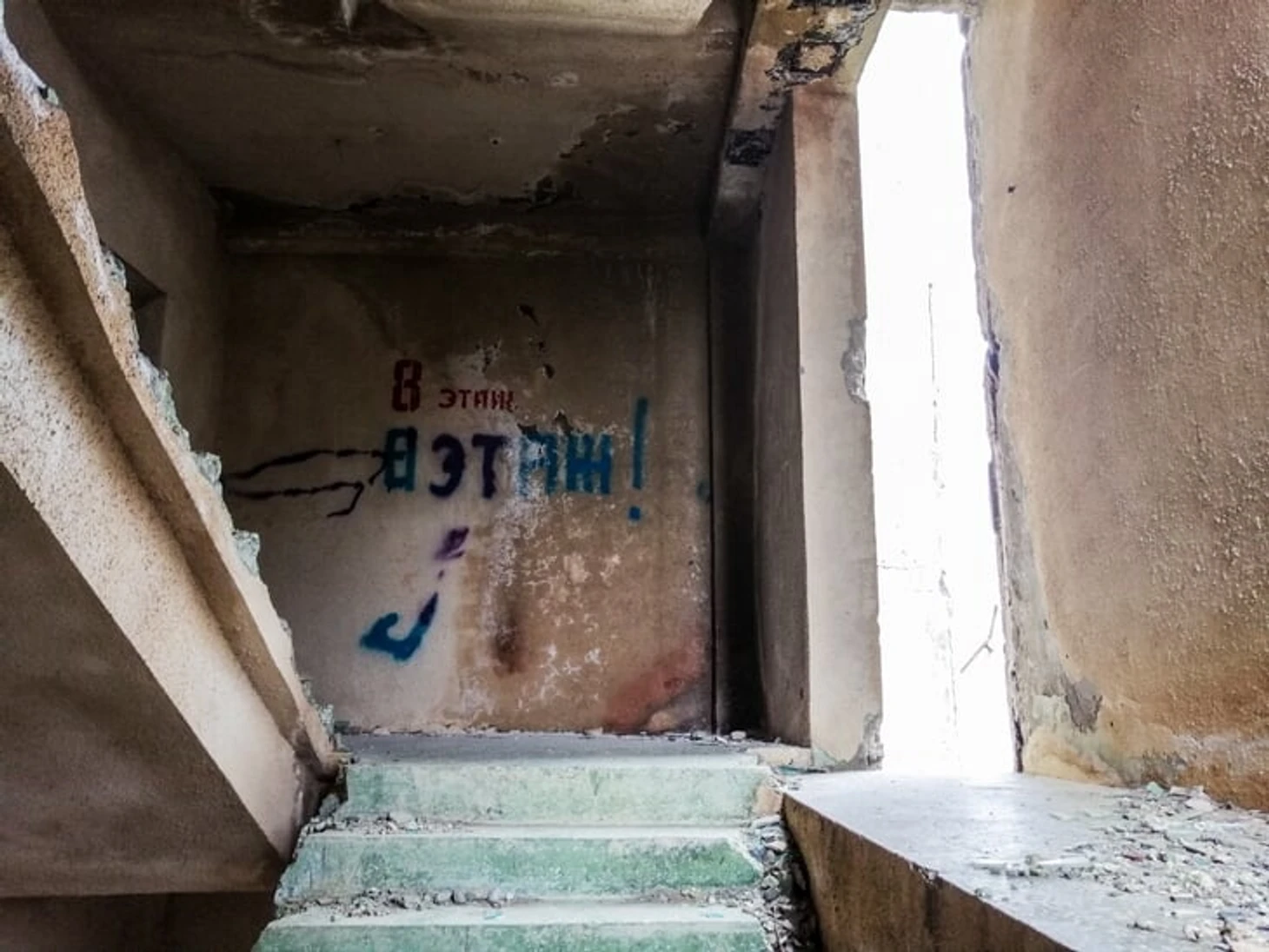 Точно угадывается только высоченный спальный корпус, с крыши которого абхазы выцеливали грузин. Что же там осталось внутри? Забираемся по ступенькам: