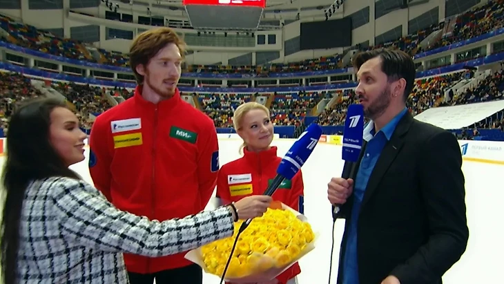 Вице-чемпионы Олимпиады-2022 – еще и ученики Транькова. Загитова обыграла это, задав вопрос тренеру пары – и протянула микрофон, хотя Максим и так держал свой в руке.