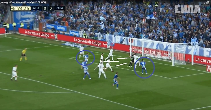 Во время углового все совершенно забыли про 7 номера Алавеса. Более того три игрока Реала к чему-то бежали в сторону своих ворот и совершенно не держали набегающего игрока. Итог: глупая ошибка, при численном преимуществе в своей штрафной, и пропущенный гол на 95 минуте.
