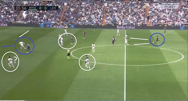 На картинке видно, что лишь два игрока Реала держат своих оппонентов, тем самым отрезая их от атаки. Но сразу же в глаза бросается момент с забросом мяча. Два игрока мадридского клуба совершенно не прессингуют игрока Леванте отдающего пас. Левый защитник, хоть и держит линию офсайда, но совершенно не смотрит на забегающего игрока и не подстраховывает своего центрального защитника. В свою же очередь игрок Леванте совершенно свободно убегает к воротам Реала, поскольку центральный защитник совершенно потерял его из виду. Итог: выход один на один и гол уже на 7 минуте матча.