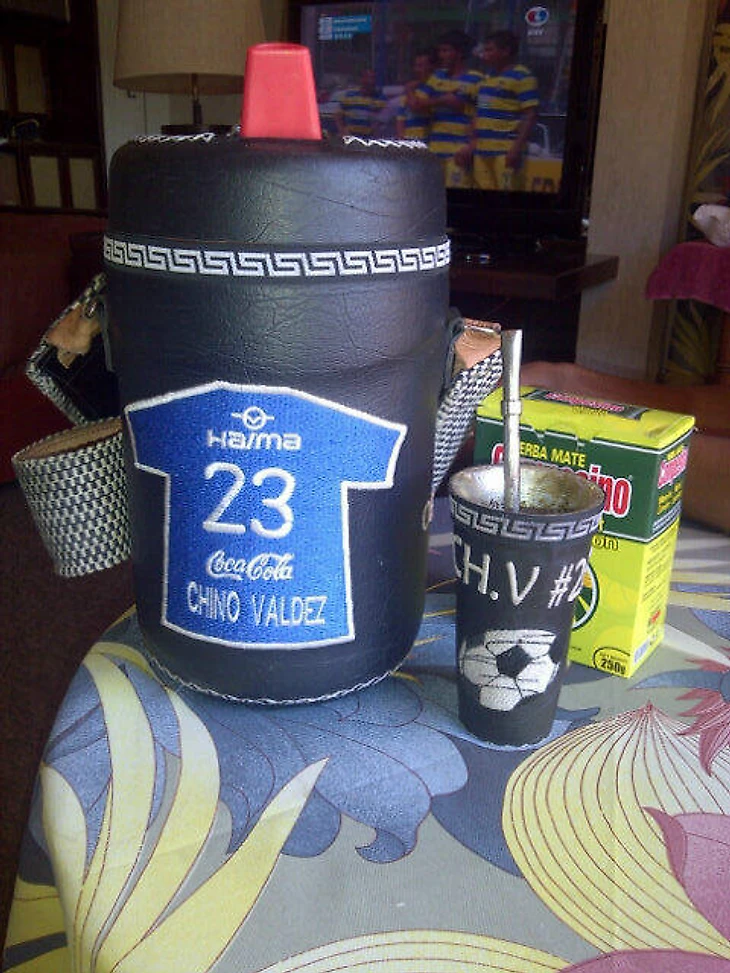 В комплект помимо термоса также входит стаканчик, исполненный в едином стиле, и металлическая соломинка. Здесь на фото - старый термос Бруно "Чино" Вальдеса, которым он пользовался, когда представлял парагвайский клуб Соль Де Америка