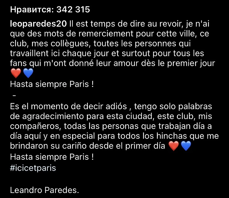 «Пришло время прощаться, и у меня есть только слова благодарности этому городу, этому клубу, моим коллегам, всем людям, которые работают здесь каждый день. И особенно фанатам, которые подарили мне свою любовь с самого первого дня ❤️💙 Hasta siempre Paris!»