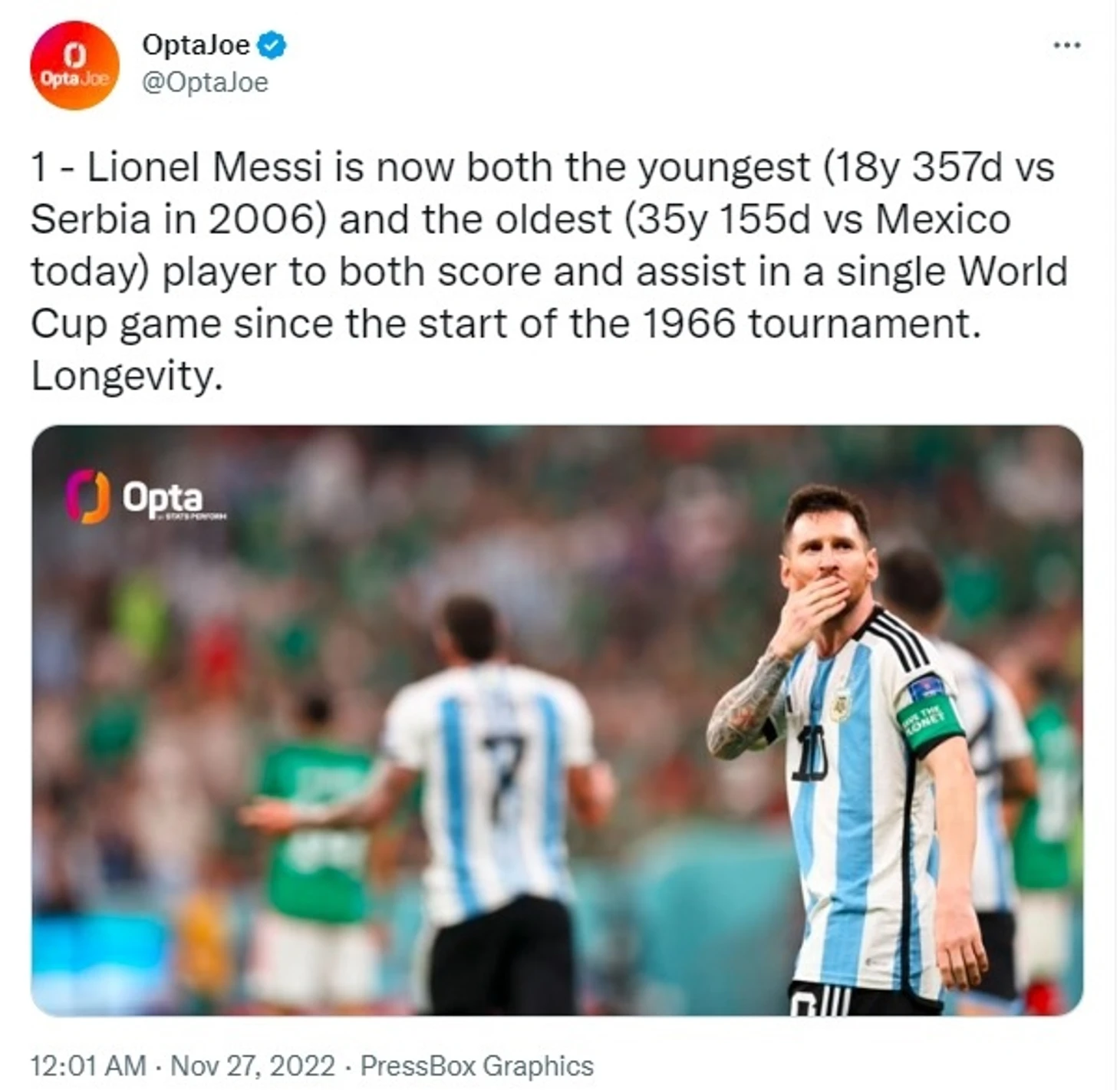 В прошедшем матче между Аргентиной и Мексикой Лионель Месси забил гол и сделал результативную передачу в возрасте 35 лет и 155 дней. Таким образом Лео не только помог своей сборной одержать победу 2:0, но и стал самым возрастным игроком, который оформил первые 1+1 по системе «гол+пас» на турнире.