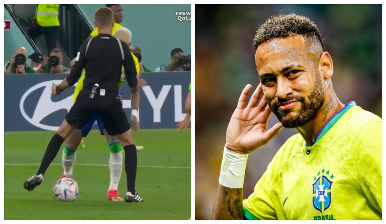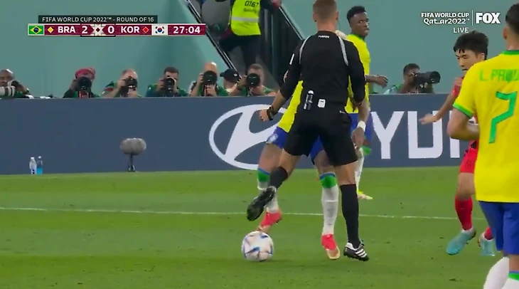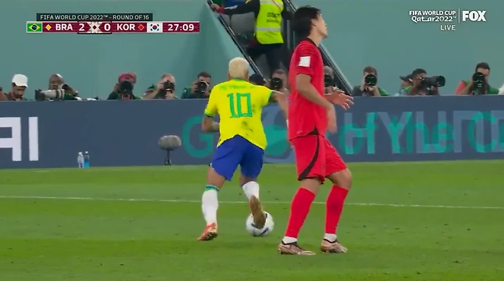 В сегодняшнем матче против сборной Южной Кореи бразильцы похоже решили поиграть в свое удовольствие. Когда счет на табло был еще 2:0, а не 4:0 к концу первого тайма, Неймар мастерски обыграл сразу троих человек: двух футболистов и судью, причем последний практически получил проброс между ног.