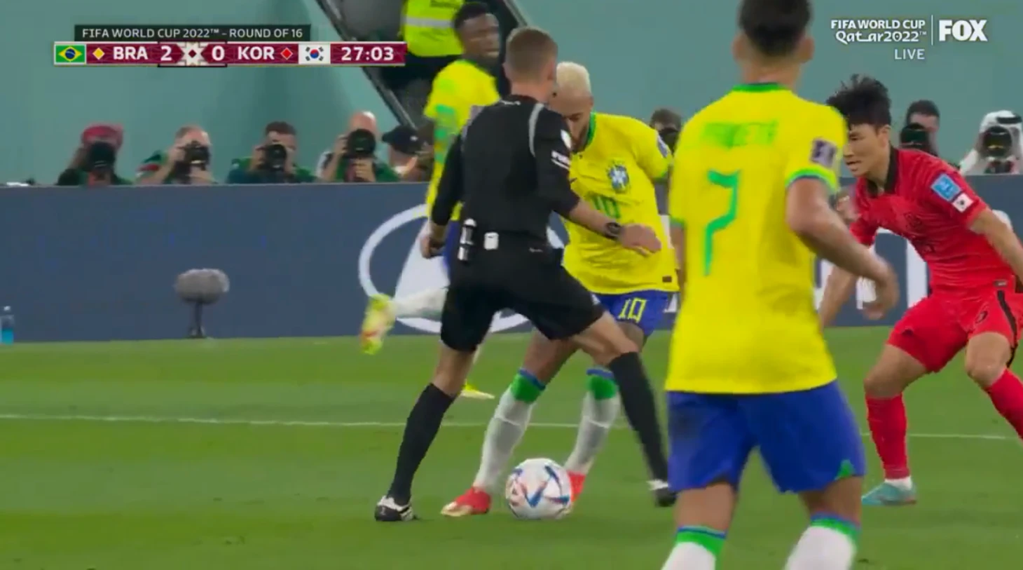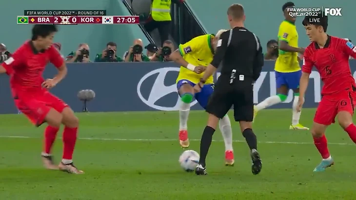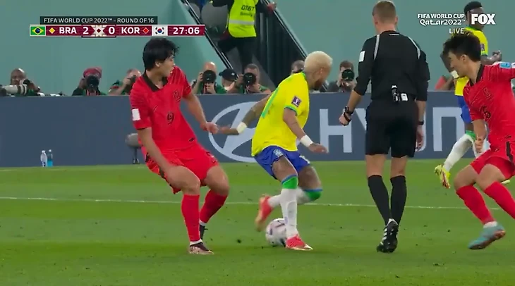 Неймар почти прокинул мяч между ног судьи. Помешали южнокорейские игроки