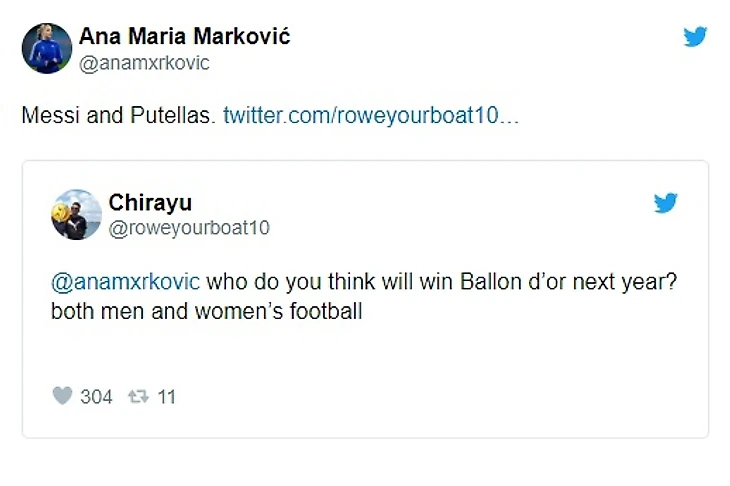 23-летняя футболистка уверена, что Лионель Месси и Алексия Путельяс в следующем году победят в борьбе за главную индивидуальную награду в мире футбола, об этом она написала в своих соцсетях в ответ на вопрос фаната.