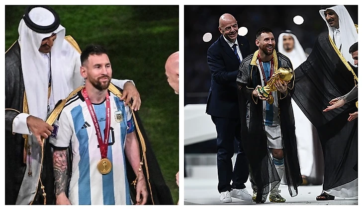 Многие болельщики увидели отсылку к церемонии награждения в Катаре - как только Лионель Месси получил свою медаль, ему надели темную накидку, которую заготовил и положил на плечи эмир Катара Тамим ибн Хамад Аль-Тани. Забирать Кубок мира Месси пошел уже в темной мантии.