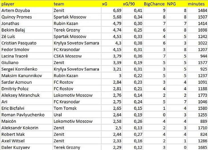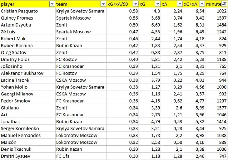 2) Смолов в топ xG всего лишь 7ой, что неудивительно из-за травм, много пропустил. По xG/90 минут также 7ой результат, а вот это уже интересно и является очередным подтверждением переоцененности Федора. Стоит пояснить почему так сильно различается место Смолова в этой таблице и таблице бомбардиров, здесь не учитываются пенальти и автоголы защитников.