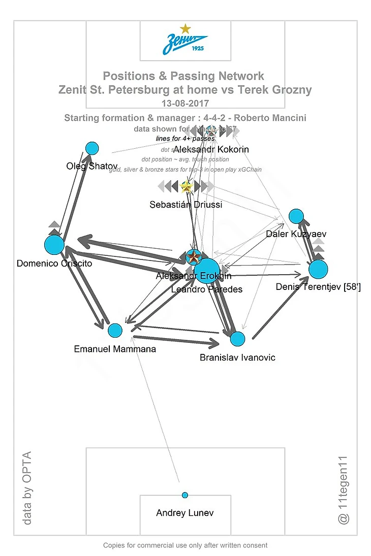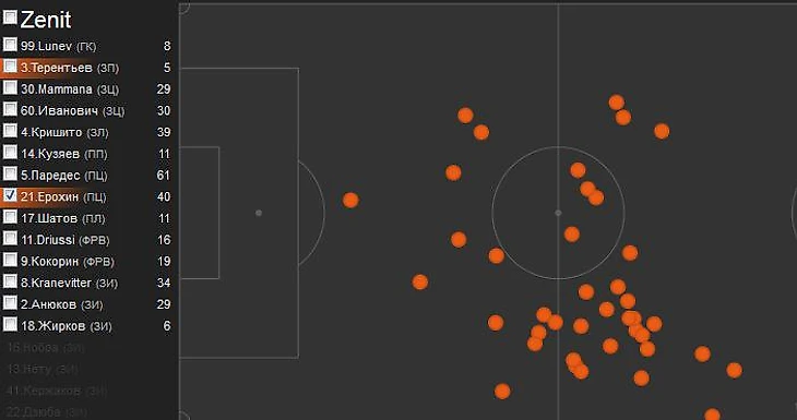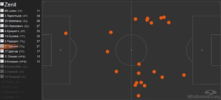 Правый фланг был менее активен, Кузяев вынужден был помогать Тереньтьеву, который не справлялся на фланге, совершил 4 потери и провел наименее выразительный матч в этом сезоне, на карте передач это нашло отображение, Кузяев располагается слишком близко.