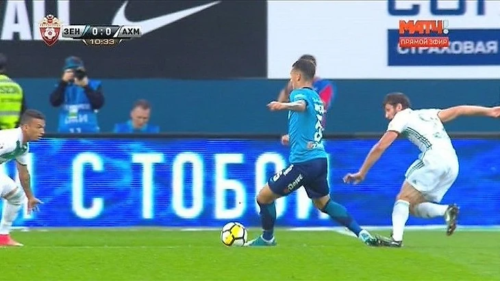 Соперник не заслужил даже намека на равную игру, кроме архигрубости и откровенных фолов в лазарет, а также совсем не горского нытья, не выделялся ничем. Непонятно о каких претензиях к судейству вещают гости с точки зрения справедливости, Ахмат должен был заканчивать матч если не в 8ом, то в 9ом точно, Анхель совершил на Кокорине в конце первого тайма ничто иное как фол последней надежды, это прямое удаление! Также был спорный момент где не поставили пенальти на Паредесе(смотри фото, где Паредес чуть не остался без ноги) и россыпь моментов где должны были быть угловые у ворот Ахмата и арбитр уже откровенно жалел униженного соперника. Еще есть вот такое мнение о первой желтой Уциева: