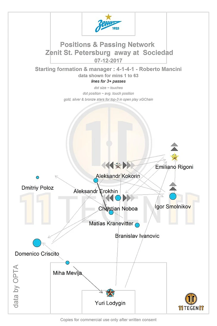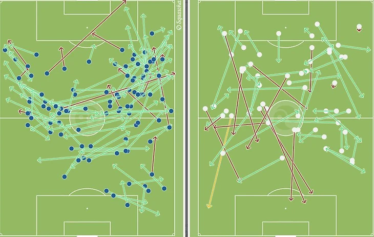 В стартовой 4-3-3 Нобоа должен был стать диспетчером, но из игры выпал, всего 16 передач за час игры, пара потерь из-за небрежной обработки мяча, но за счет трудолюбия и желание, эквадорец подсластил пилюлю. В первую очередь за счет позиционного расположения в обороне, конечно это не самая трудная задача против команда, которая сама валится на фланги, но свои 5 перехватов Нобоа сделал, что для него просто феерический показатель. Долго думал как донести провал полузащиты в продвижении мяча, посмотрите на карту передач, слева карта Ильяраменди – карта диспетчера в 4-3-3, а справа общая карта передач Ерохина- Нобоа-Краневиттера, комментарии излишни как по количеству (104 у одного Ильяраменди против 57 на троих наших ЦП) так и по качеству с точки зрения продвижения мяча.
