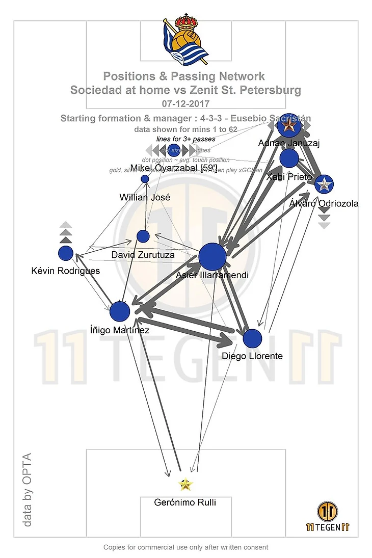 Отдельный абзац нашему герою, монолиту и капитану. Хвалить Кришито уже стало мейнстримом, но как тут промолчать? Да, итальянец не блистал в атаке, показал 58% точность передач, но тут важна трактовка цифр. Во-первых, 5 передач были сложными лонгболами, сделанные под давлением в попытке хоть как-то построить атаку. Во-вторых, посмотрите на карту положений и связей Реала, на фланге Кришито живого места нет, разумеется ядерное трио Одриосола-Янузай-Приетто сразу же бросались в контрпрессинг после потерь. А теперь немного сухих цифр – 11 отборов (8 успешных), 4 перехвата, 7 выносов, 2 заблокированных удара. Итальянец мощно сдал экзамен под бешеным давлением, надеюсь представители итальянских клубов не смотрели матч (конечно смотрели или посмотрят). На другой чаще весов результативная ошибка, к исходу тайма Янузай эффектно прошел Кришито на дриблинге и отдал голевую передачу, ожидаемая ошибка после часа бросаний на амбразуру, но тут больше стоит хвалить Янузая чем ругать капитана.