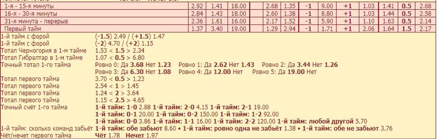 Вот такая картина. Гибралтар, за последние 7 игр крупно проигрывал первый тайм лишь двум командам, Норвегии и Болгарии. А Черногория смогла крупно обыграть лишь Кипр. Давайте глянем на линию букмекера на этот матч: