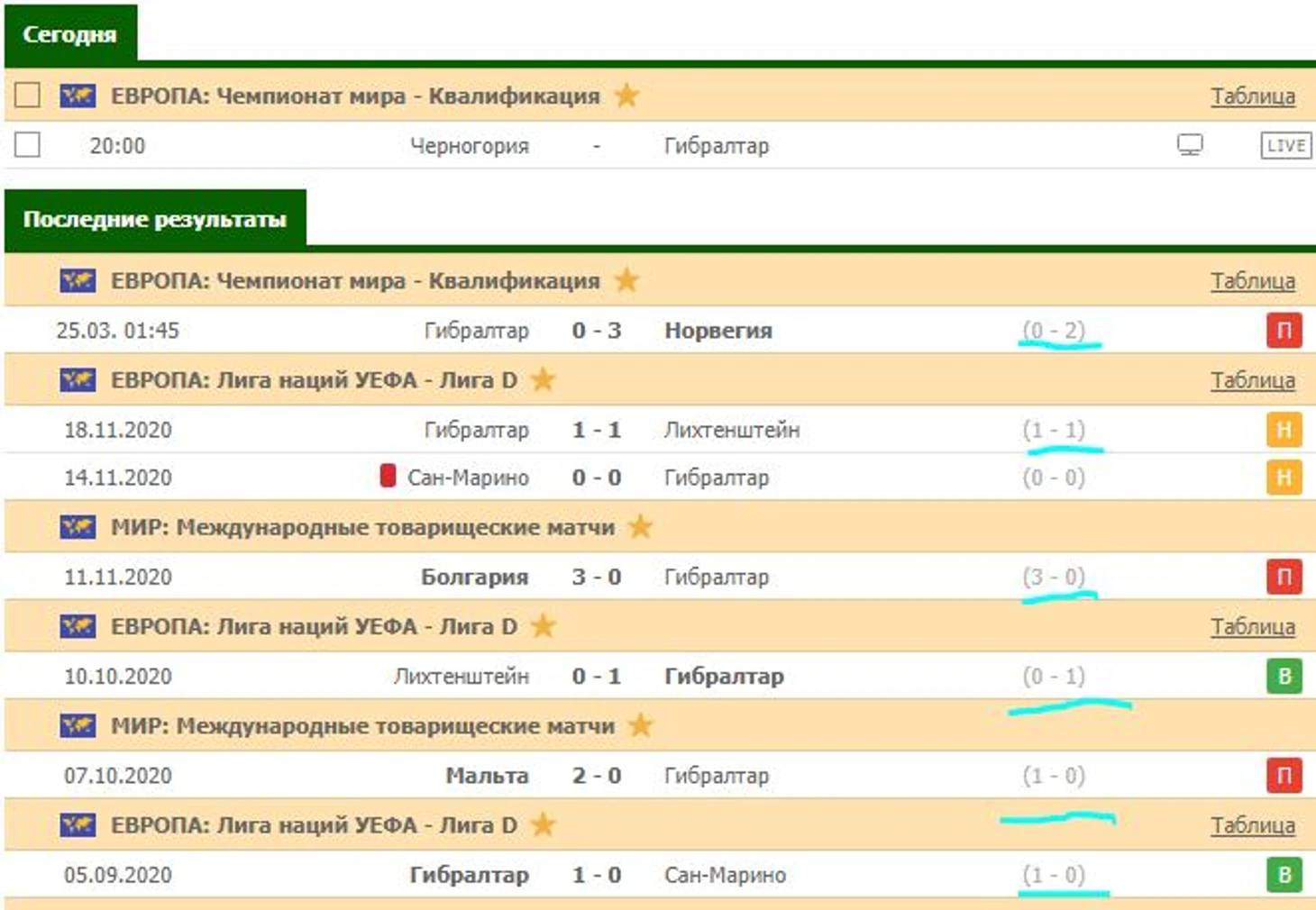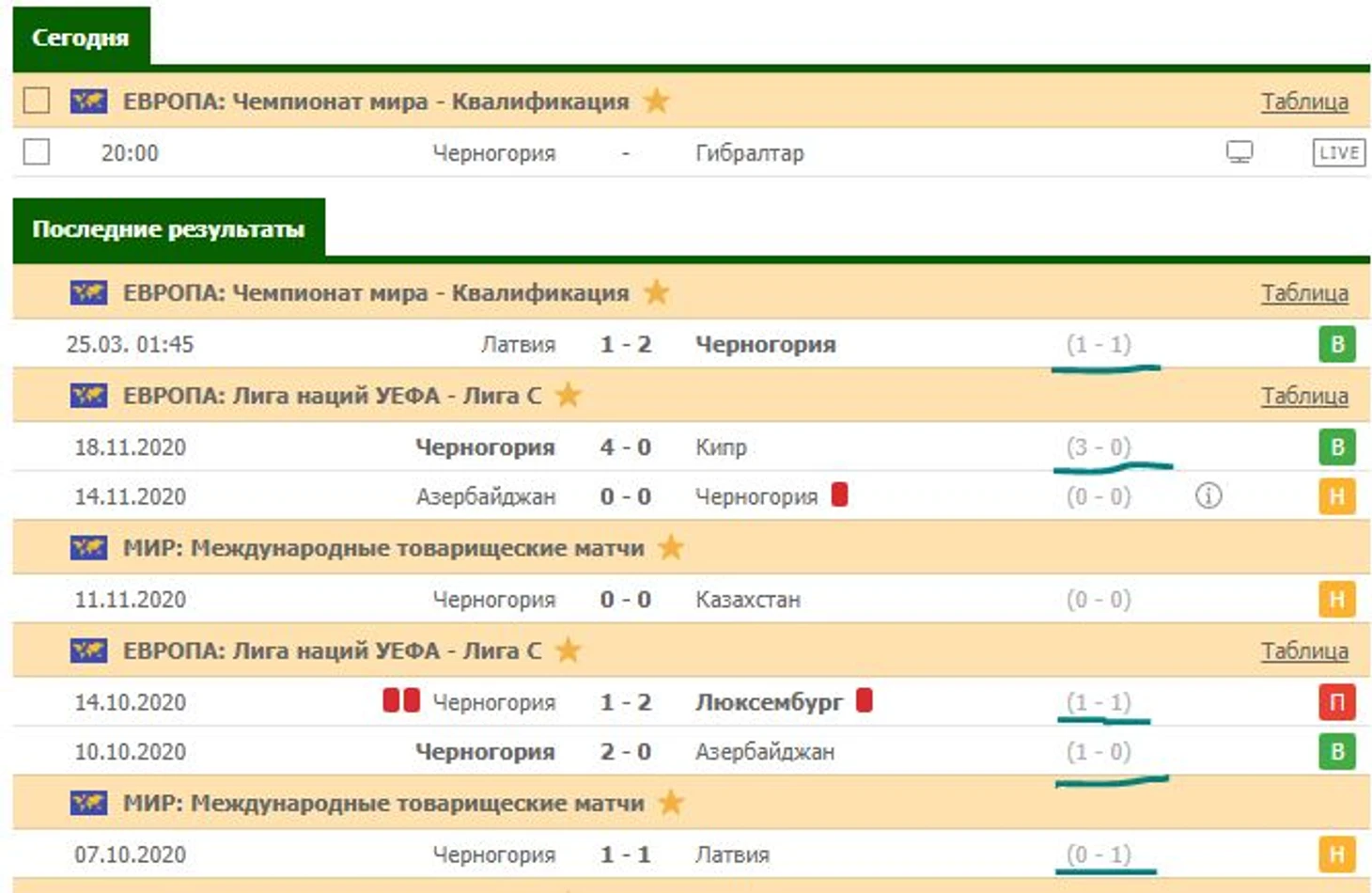 Вот вся картина, из прошлых игр Черногории. Справа, зеленым маркером отмечены результаты первых таймов. Два тайма закончились сухими нулями, в двух встречах сильнее были черногорцы, и в одной встречи они первый тайм уступили.