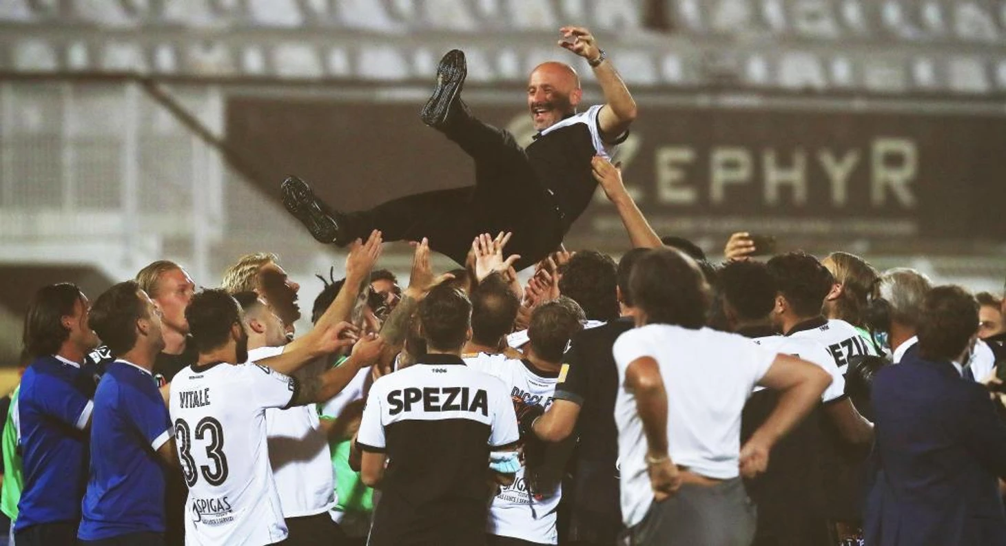 Прежде, чем попасть в Серию А, «орлятам» пришлось пройти через две стадии плей-офф, в которых команда встречалась с уже упомянутыми «Кьево» и «Фрозиноне». Регламент Серии В таков, что лишь две первые команды турнира выходят в главный футбольный дивизион Италии напрямую. А вот клубы, расположившиеся с 3 по 8 места, ведут борьбу за последнюю путевку в играх на вылет. Так как «Специя» заняла третью строчку в Серии В, то ждала соперника сразу в полуфинале плей-офф. Им стал «Кьево» (6 место), который также рвался в Серию А. Тут нужно остановиться на короткий рассказ о главном тренере «орлят», который является главным творцом успеха команды в предыдущем сезоне.
