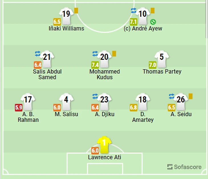 Гана начала матч в таком составе (на картинке вы можете увидеть и оценки игроков по версии Sofascore).