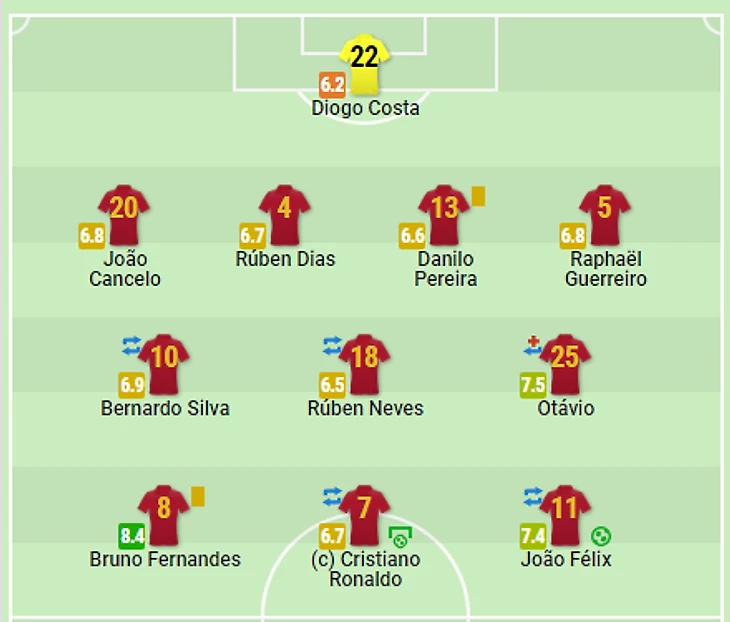 Собственно Португалия начала матч с Ганой в данном составе (на картинке вы можете увидеть и оценки игроков по версии Sofascore).