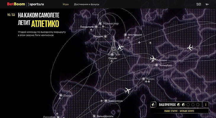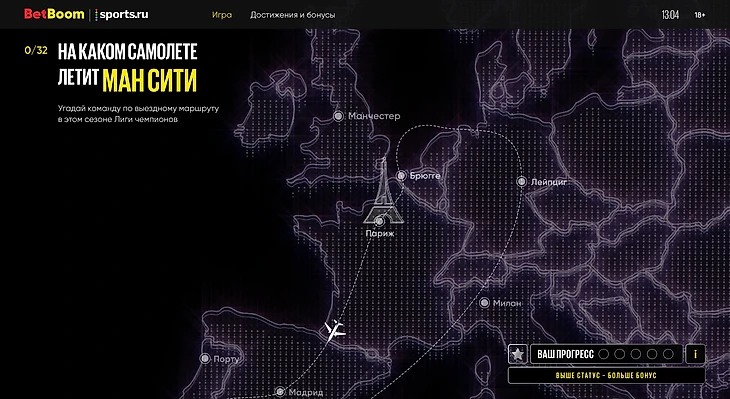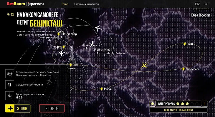 Механика спецпроекта простая: нужно угадать, в каком самолете летит одна из 32 команд Лиги чемпионов. Можно угадывать по направлению полетов (вы же помните, что «Реал» половину апреля провел в Англии?), можно ориентироваться на подсказки. Чтобы не было слишком легко, мы не показывали домашний город. А для дополнительной мотивации BetBoom дарил подарки, если вы угадывали несколько команд подряд.