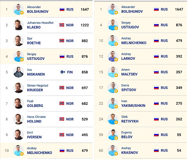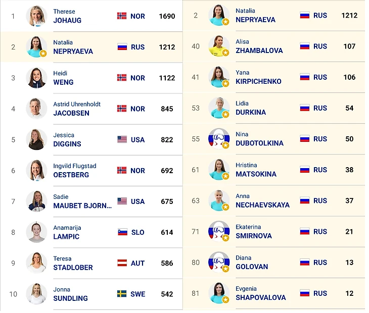 Ну а Наталья Непряева сохранила второе место в тотале и сейчас ее отделяет от Венг 90 очков. Борьба за второе место будет напряженная. Первое место, думаю, уже давно всем известно кто займет).