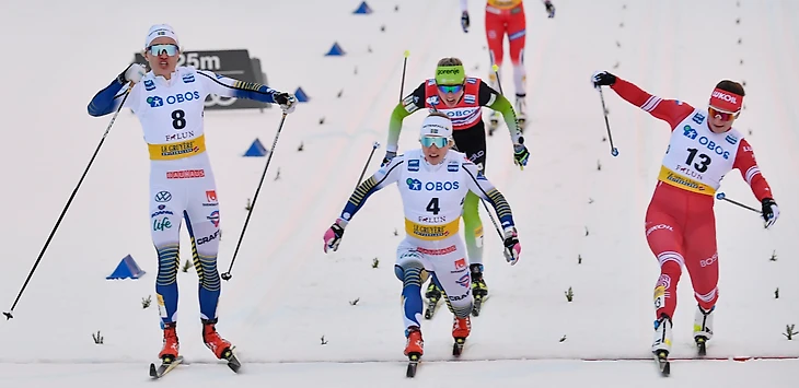 Состав нашей сборной: Большунов, Устюгов, Спицов, Мельниченко, Мальцев, Якимушкин, и Белов.Перед гонкой явным фаворитом был Большунов и главная интрига была в том, какой компанией норвежские лыжники (Рёте, Холунд, Крюгер, Сундбю и Ко.) добегут до финиша c Александром, если будет без происшествий. Происшествие было. Рёте случайно сбил Большунова при обгоне. Место падения было «удачным» так как Большунов не потерял много времени, быстро поднялся и продолжил гонку. К последнему подъему Большунов с Рёте оторвались секунд на 10 от Крюгера, Холунда, Якимушкина и Мельниченко. Крюгер самоустранился, упав перед подъемом, и потерял все шансы на медаль. Александр ожидаемо легко разобрался с Рёте на финише, ну а Иван Якимушкин второй раз в сезоне поднялся на подиум. Итог для нас получился отличным! Большунов еще на 130 очков оторвался от Клэбо (100 очков за победу и 30 очков бонусов). Мельниченко очередной раз доказал, что в коньке он готов дать бой лучшим лыжникам. Белов и Мальцев тоже показали тот уровень, на который готовы, а вот Устюгов находится явно не в форме после Тур де Ски и до последнего круга проигрывал даже Пеллегрино! Но все-таки на финише Сергей опередил итальянского спринтера. Денис Спицов разочаровал больше всех, так как он специализируется на коньке и я ожидал от него большего. Информации от тренерского штаба не поступало о каких-либо проблемах со здоровьем. В принципе результаты у него не плохие – 5 раз был в десятке, но хочется увидеть его на подиуме.