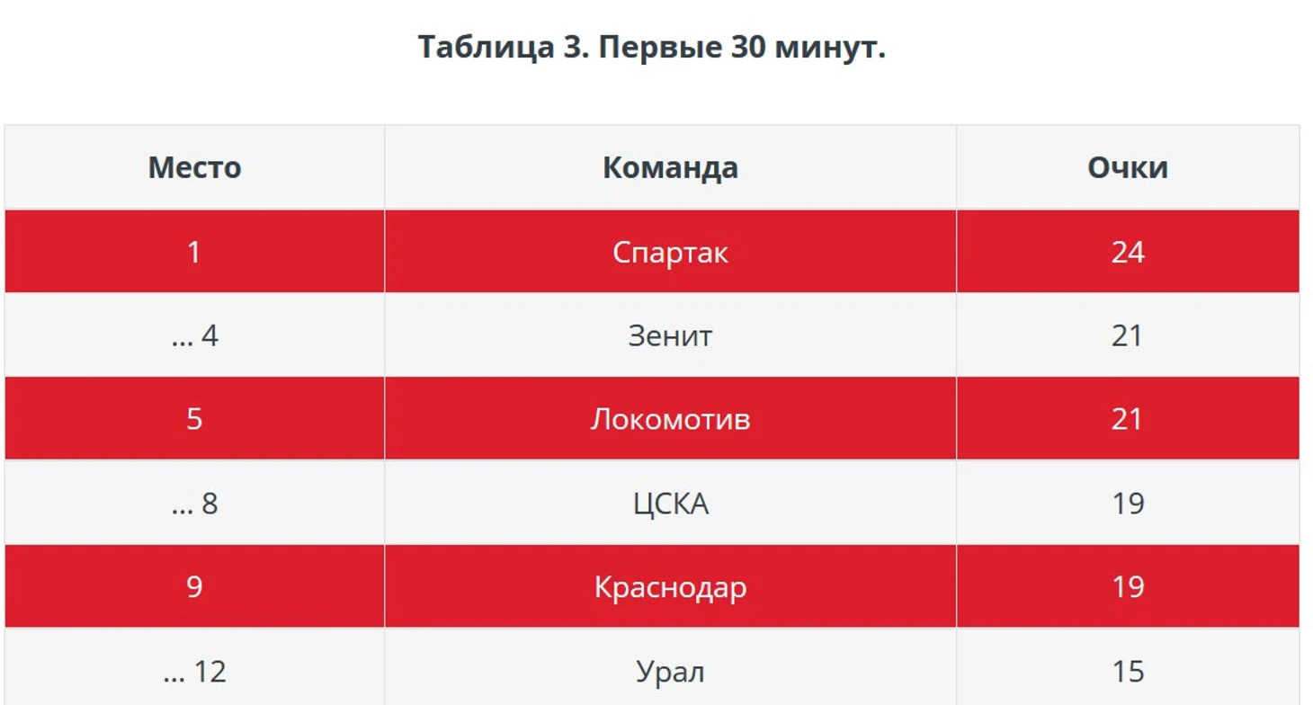 Как мы видим, все команды из топ-6, за некоторым исключением «Зенита» начинают матч одинаково осторожно. «Спартак» в первые 15 минут не пропускает, но и не забивает.